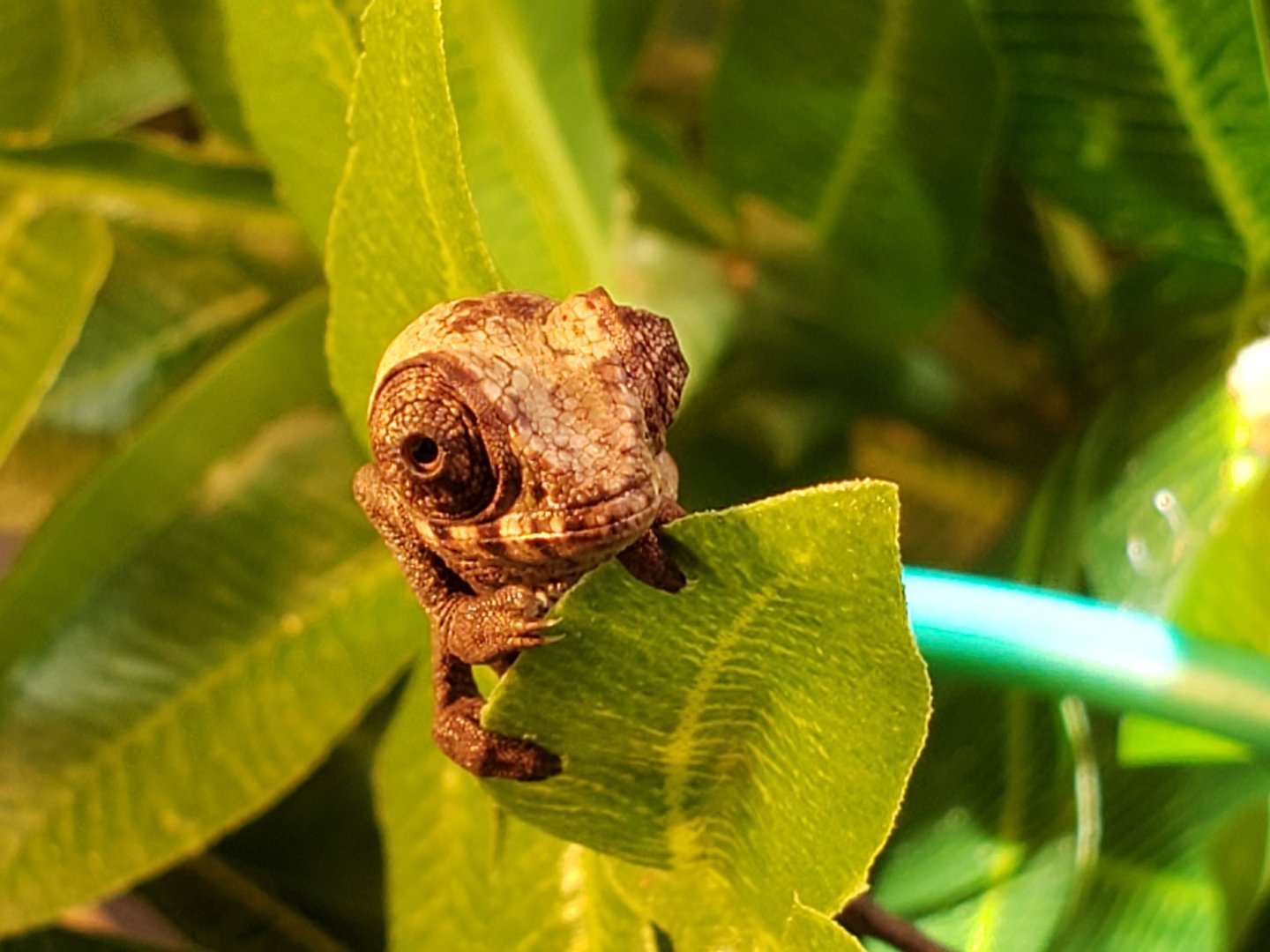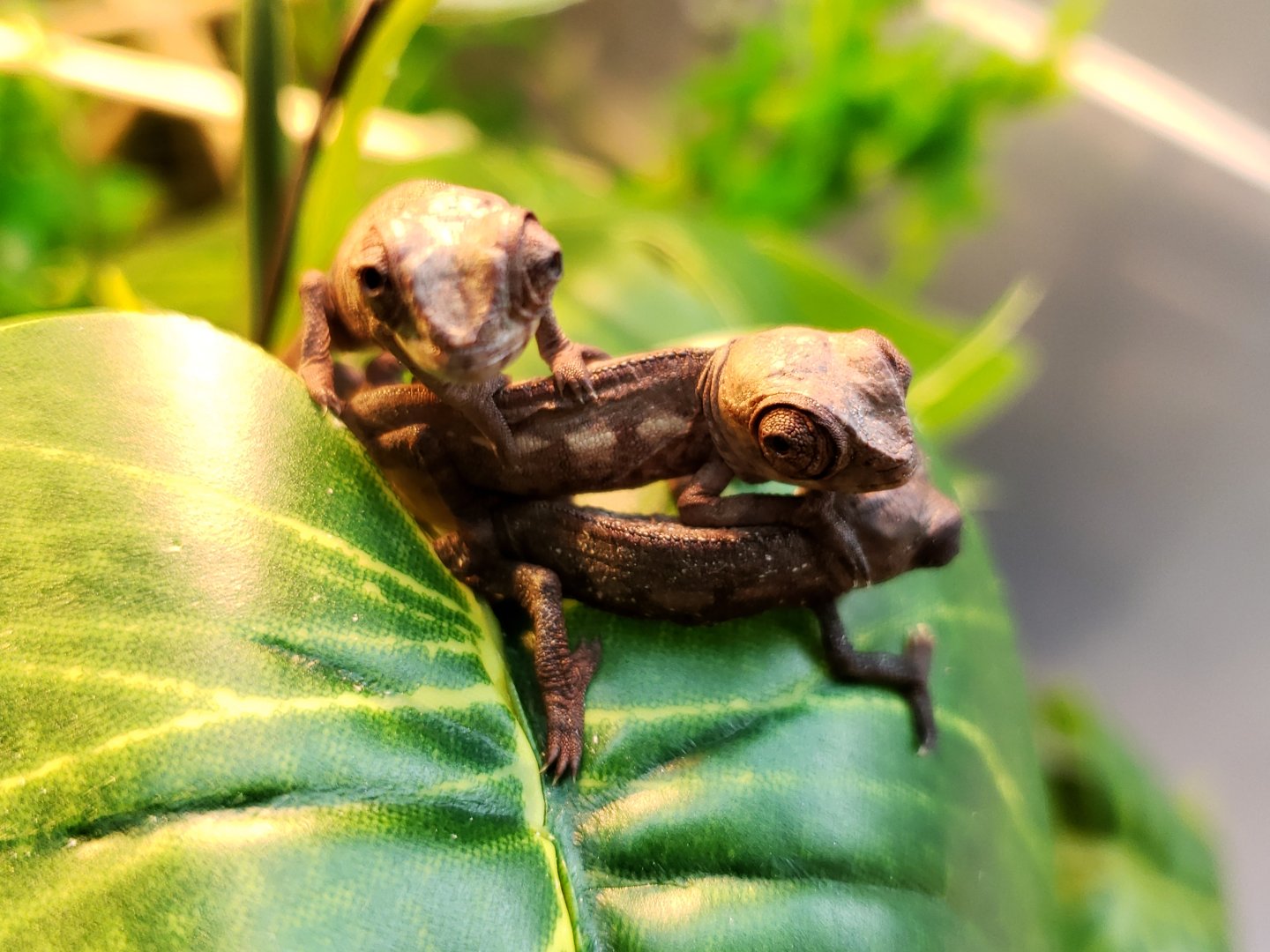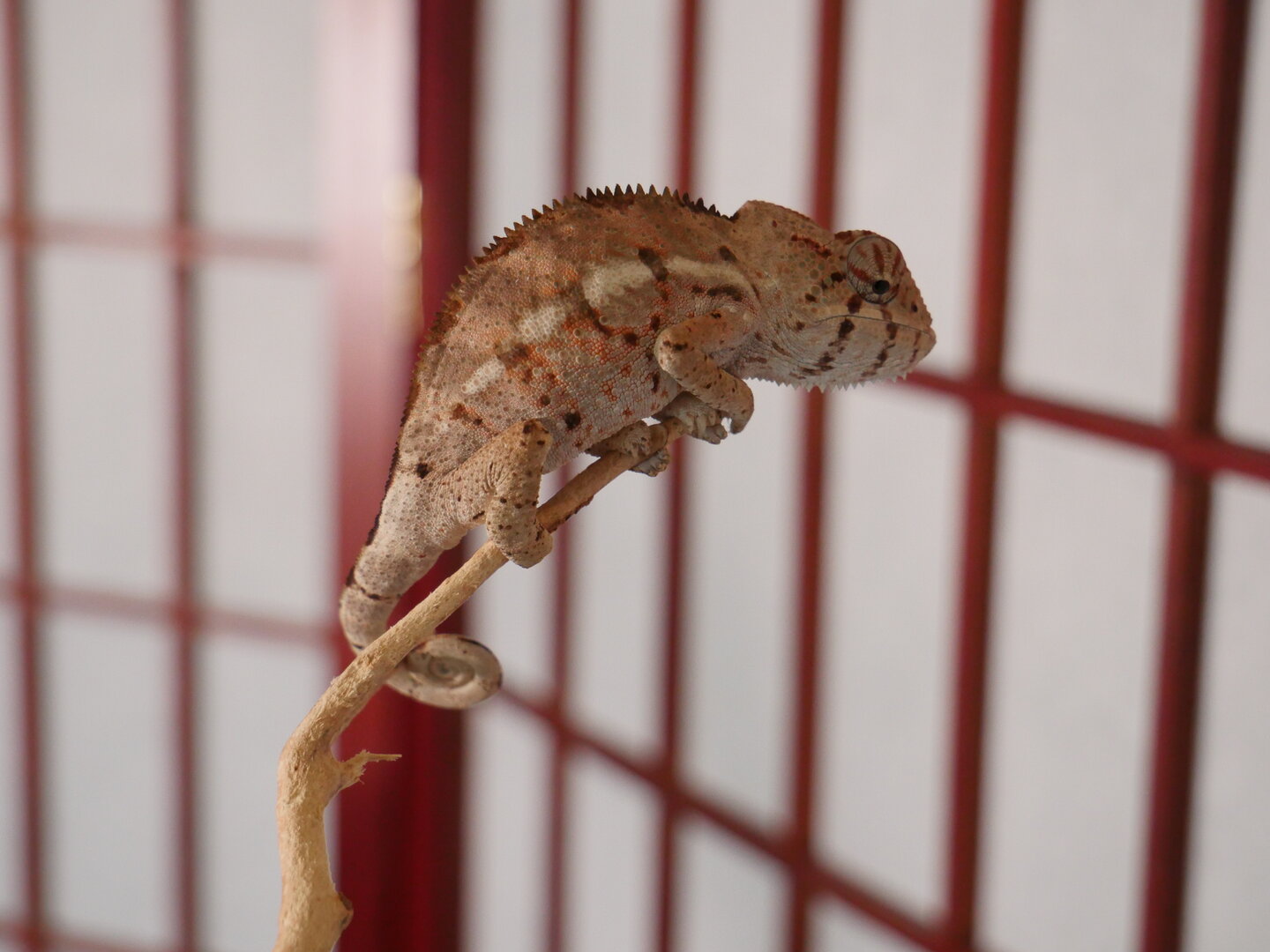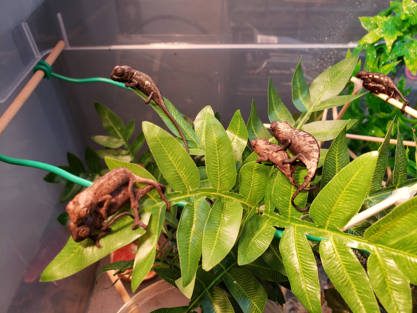 Sorry I don't have ANY pictures of Esmerelda's parents, I got them for a hobbyist that didn't understand chameleon care, they said they bought her from FL Chams (So she should be from the Clayton line). They would have killed her eventually if they had her much longer than the 3 months they did. So she's kinda a rescue in a way.