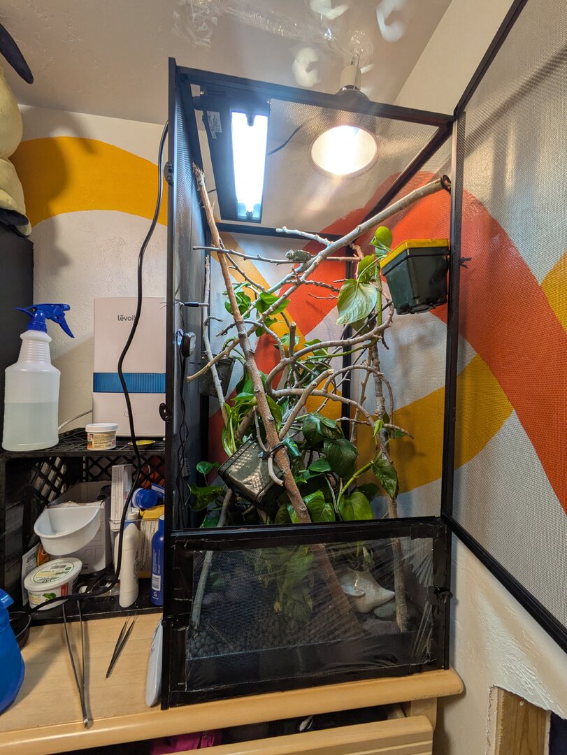 Cage/Enclosure: 18x18x48 (LxWxH) He came with the Zoo Med Deluxe Chameleon Kit (https://www.lllreptile.com/products...MImNuZwMHliwMVAM_CBB2NciNQEAQYASABEgIKy_D_BwE) I'm using everything that came with it but none of the fake plants/vines because I already had a big pothos for when I did get a cham. I have many branches in a variety of thickness (most relatively thin since he's juvenile). Plenty go horizontal and some nearly vertical but still have a slope. The pothos vines are all over the enclosure so he can get anywhere he wants. I also have little clay balls (hydro balls) at the bottom of the enclosure and some flat and smooth stones as well.