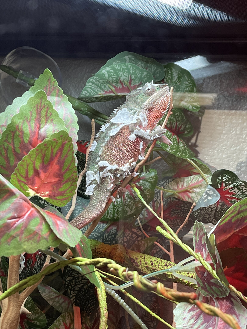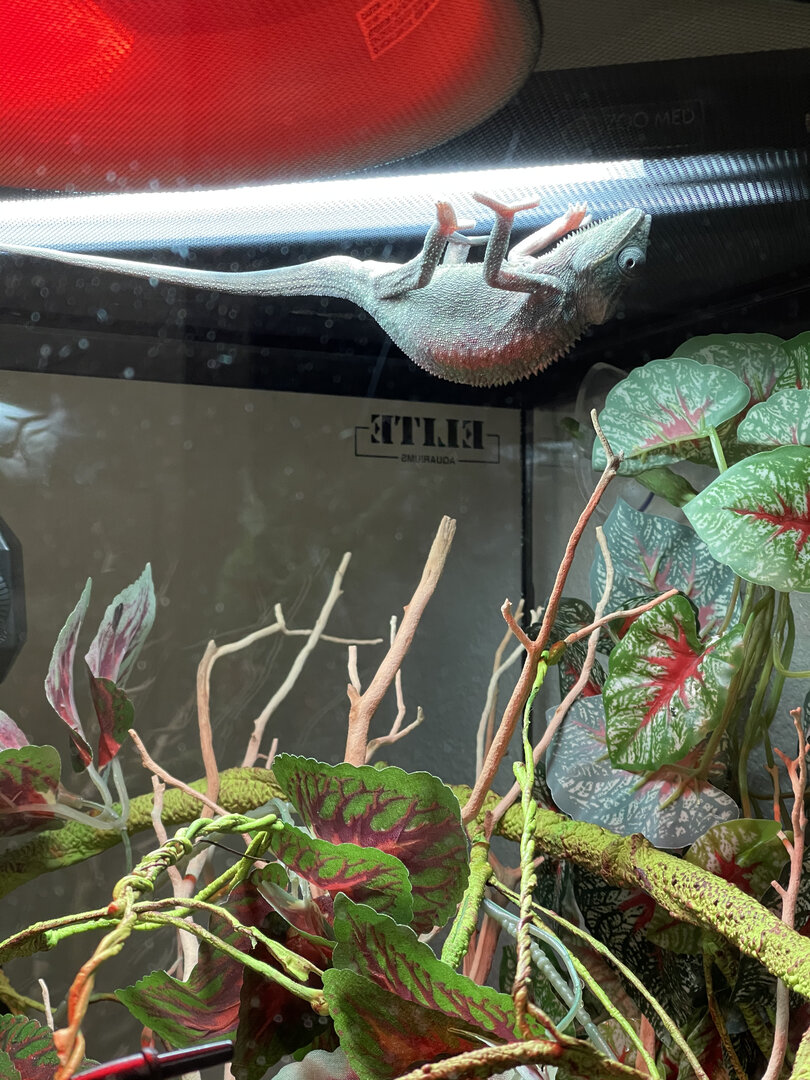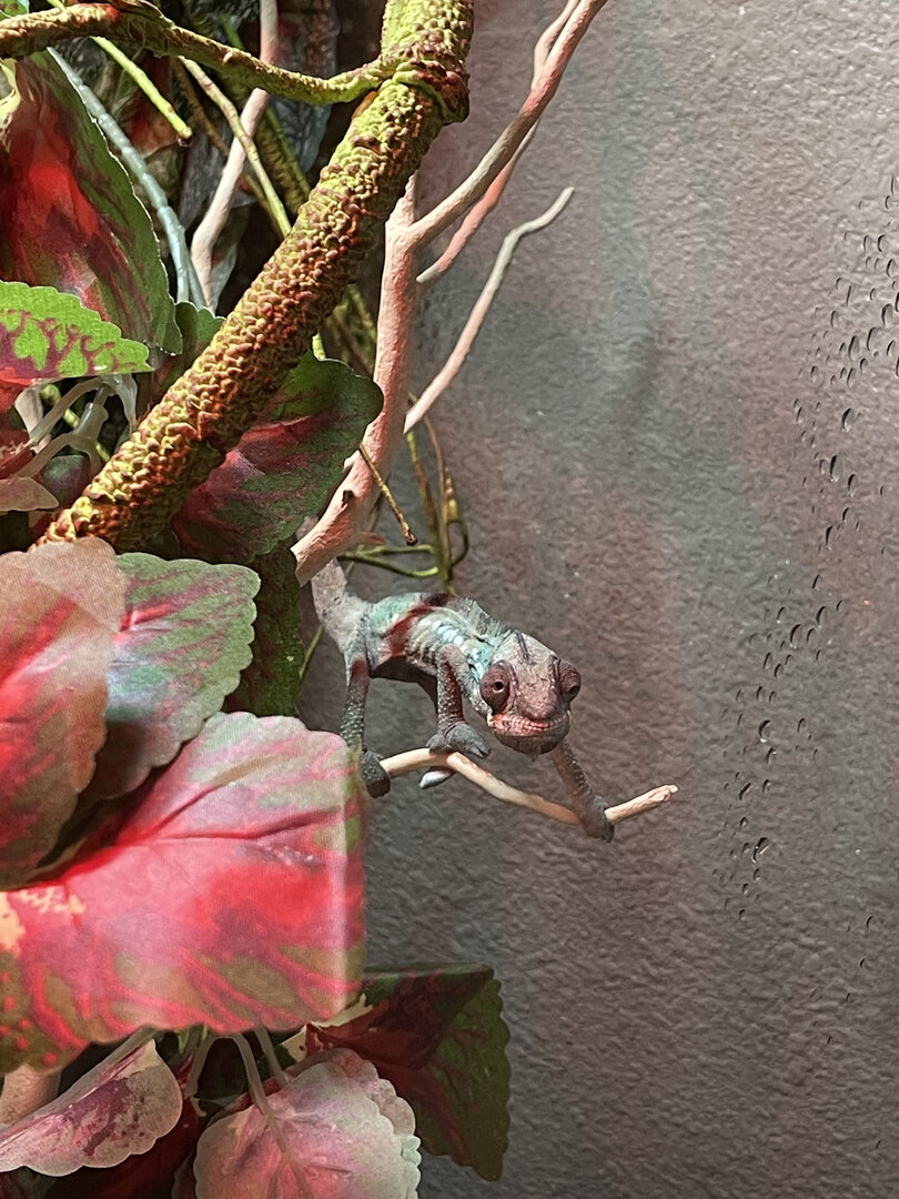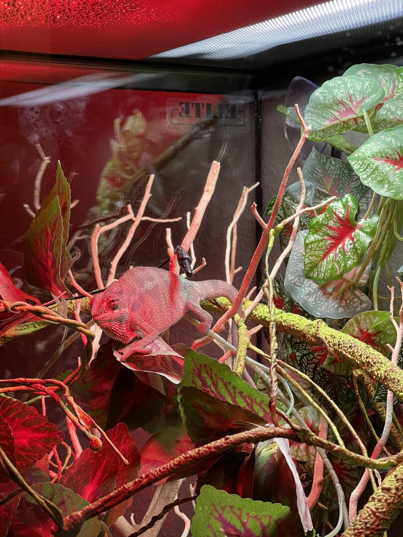 - Your Chameleon - The species, sex, and age of your chameleon. How long has it been in your care? I have a red body blue bar ambilobe panther chameleon, he is a male. He’s about 3 1/2 months old and I have had him for 5 days.