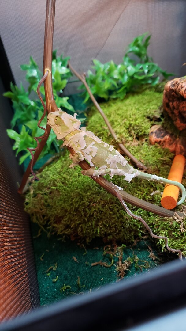 • Your Chameleon - Veiled Chameleon, Female, I think a few weeks old not sure, i have had her for 1 day We will be able to tell when the shed is complete and we can see close up pictures of her back feet to see if there are tarsal spurs or not.