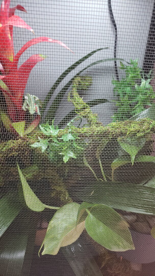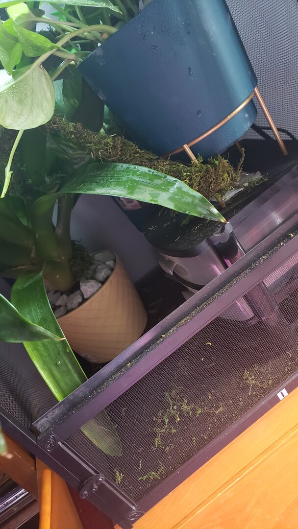 • Plants - I have no live plants all fake except for the moss and one of the vines is real. Currently building it more. Need help with this. Pothos, dwarf umbrella plants are good options. You will need to cover the soil of plants with 1 inch or larger rock so it does not eat the soil. I recommend a bare bottom cage for easier cleaning.