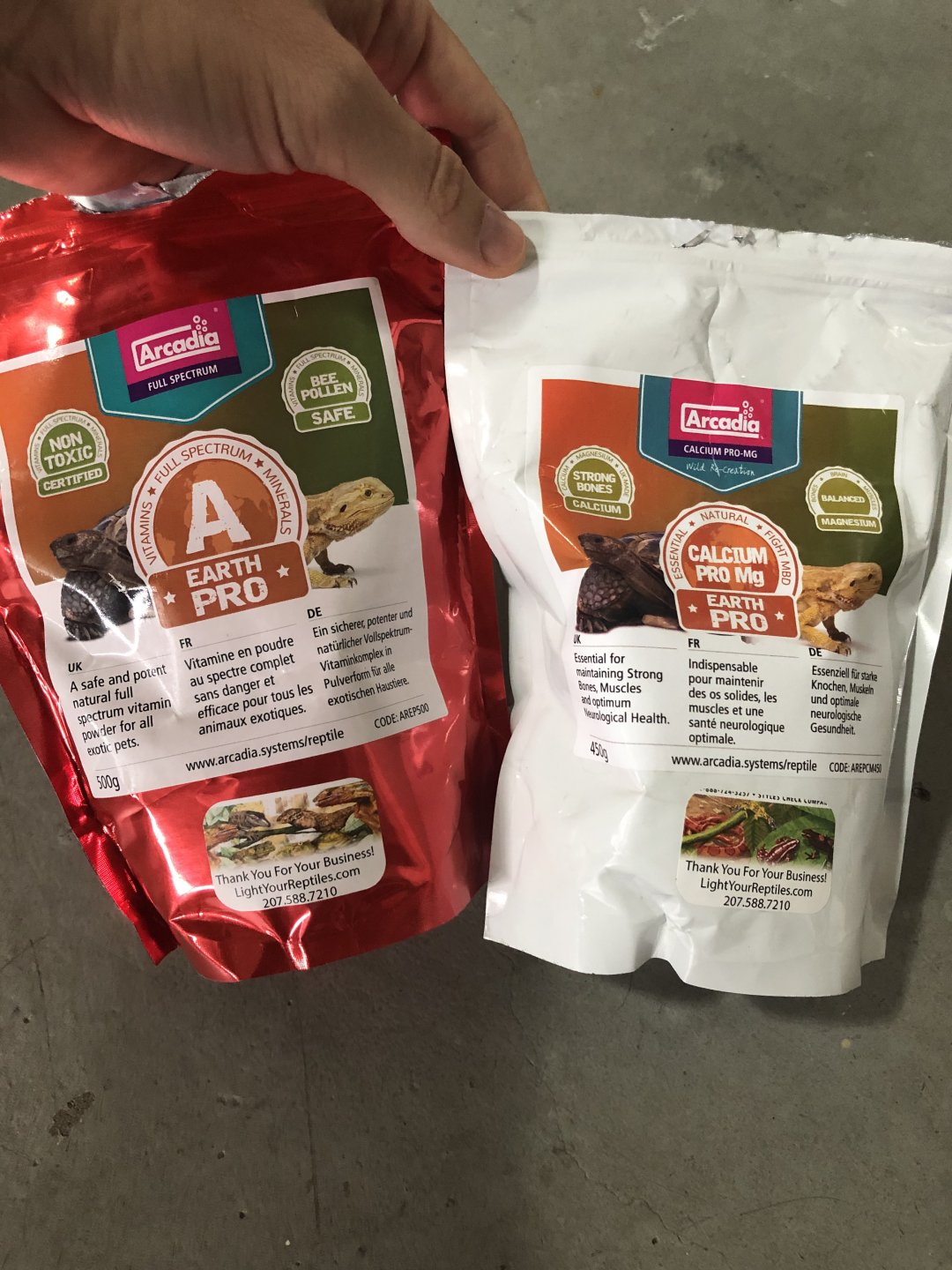 - Supplements - Alternating feeding days, dusting with w/ either Arcadia EarthPro A or Arcadia Calcium Pro-Mg