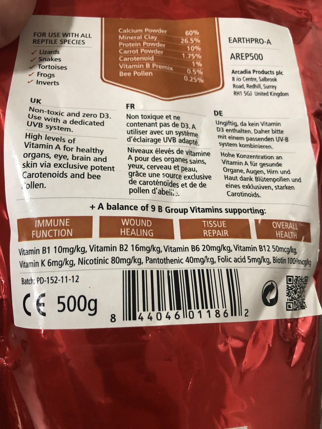 I chose my supplement schedule after listening to John Courteney-Smith, MSRB on the chameleon breeder podcast. Are any of you using Arcadia EarthPro A (label photo below) and Calcium Pro-Mg supplements? I am wondering if I still should be using a traditional D3 supplement a couple times a month.