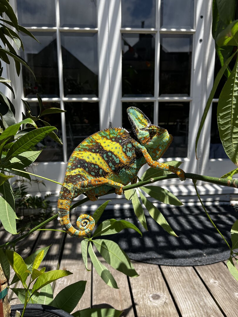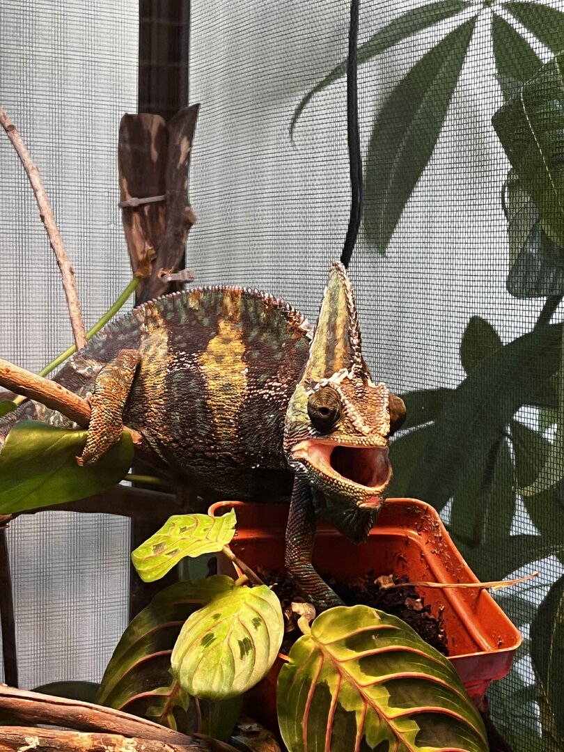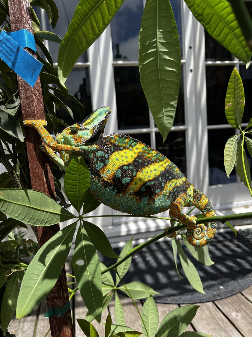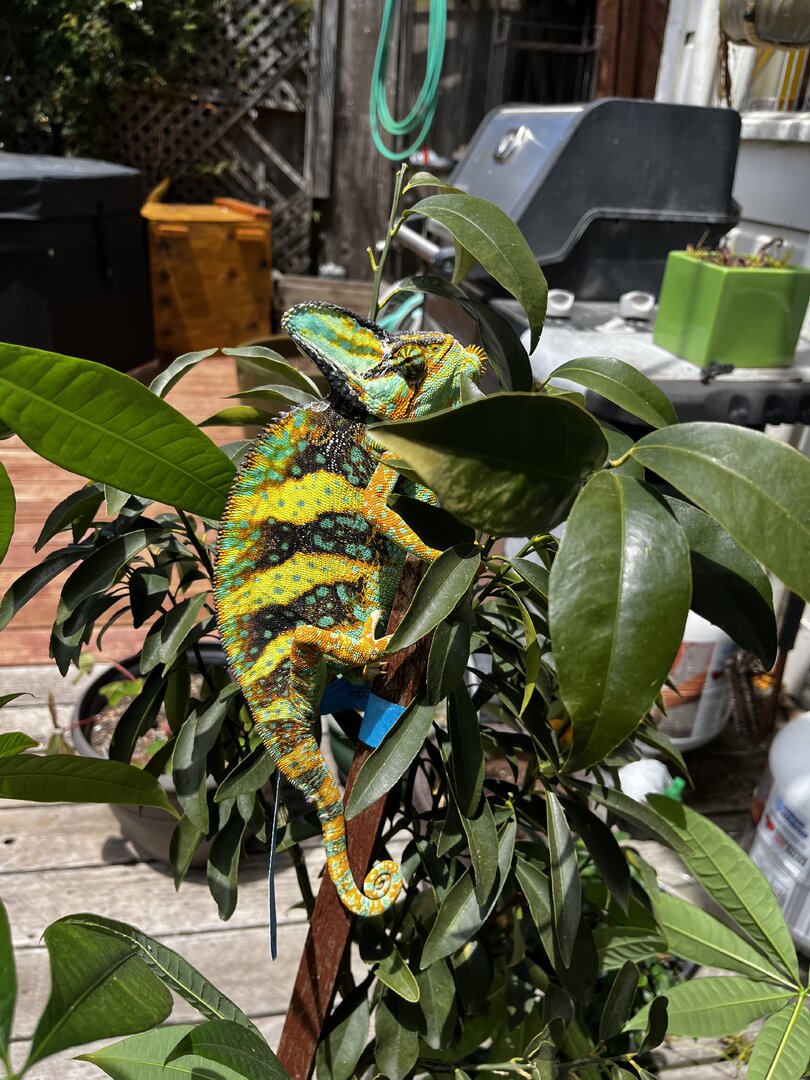 Today I decided to take him outside for some real UV on his favorite plant, our 5 ft tall money tree. Our climate: very sunny, 70s, a bit windy. He really seemed to hate it... Was puffing up and showcasing his absolute brightest colors. It was beautiful, but I don't want to stress him out! Since getting back in his enclosure he's been pretty brightly colored, watching me and was even gaping for a bit. (Pics attached)