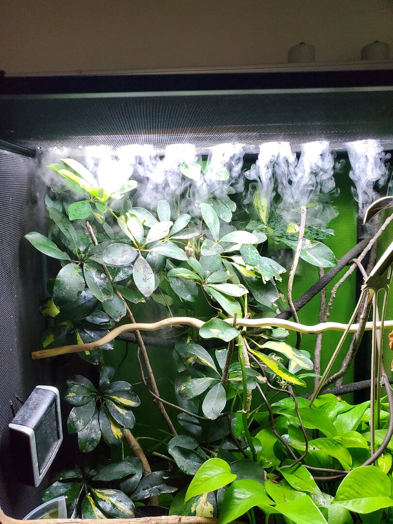 I love this idea I think I’m going to try and do the same. Looks really cool.I like this top fill fogger from Pets Pioneer, using 3/4in. pvc pipe to go on the top of the enclosure. Drilling several holes in the top piece of pipe.