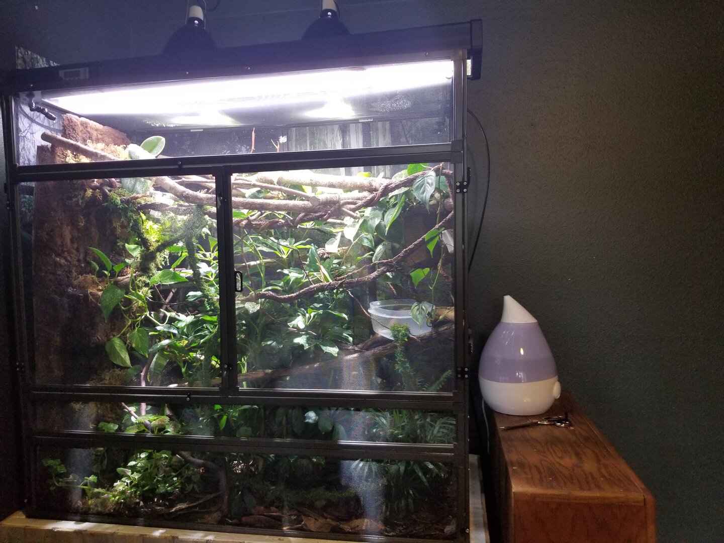 I am concerned that I need different lighting arrangements different than what I planned to use. And if I do need a recommendation what I need or if what I have will work please let me know. I also have plants and didn't factor that into the lighting needs. I also recently bought a fogger and don't know if it is necessary or if I could put it to good use. Lastly I am wondering about when and for how long each of these various devices needs to be on for. I admit it I kinda got over my head with this and didn't think it out as well as others on this site and I haven't owned a Chameleon in over 14 Years but wanted to get back into it. I hope you can help. Please feel free to critique my setup and give me any recommendations you may have so I can get this thing into high gear. See above for lighting, and yes I would say fogger or cool mist humidifier is going to be necessary for your environment. You are going to need it set up, and just constantly monitor the humidity levels with a weather station https://www.amazon.com/gp/product/B075QBRR6S/ref=ppx_yo_dt_b_asin_title_o06_s00?ie=UTF8&psc=1 (or something similar) get an extra sensor. One for top of cage and one for bottom. You misting schedule will be dependent on that.
