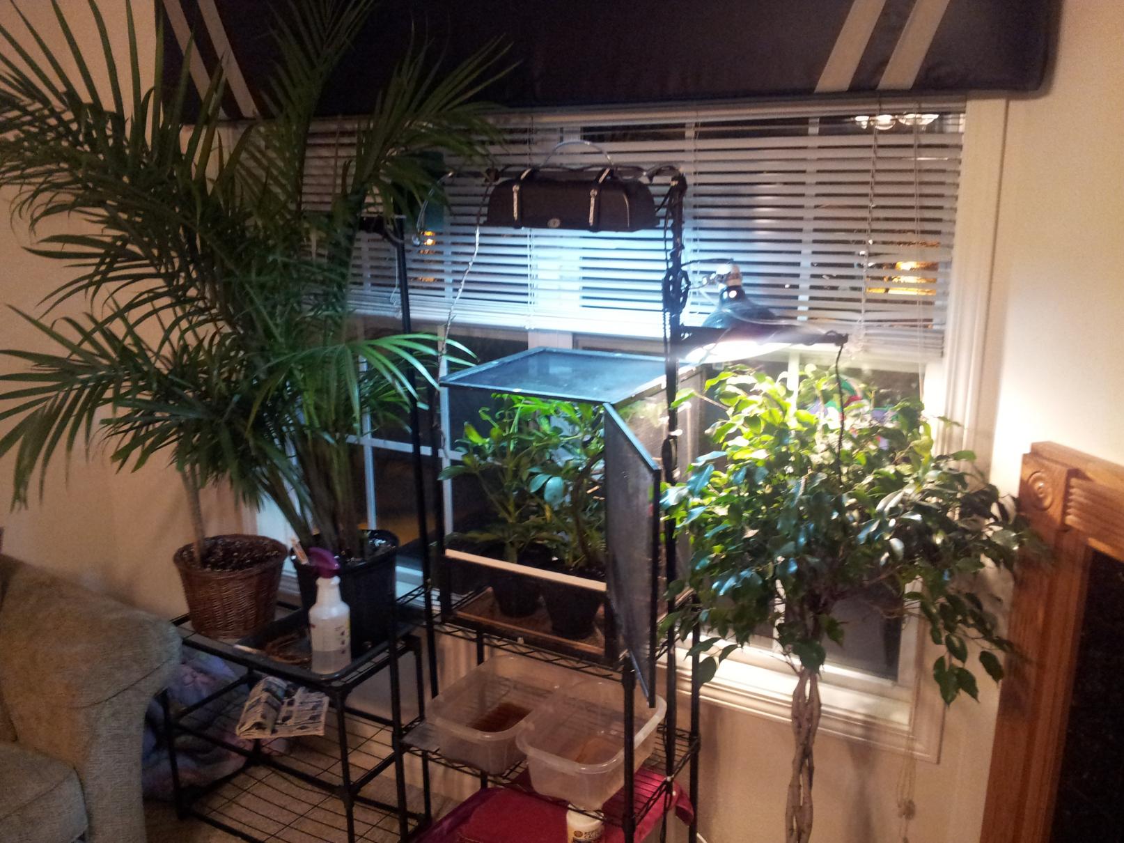 So this is the Free Range I setup for my 7 month old veild. His cage is in the center and I have walkways going in both directions above the UVB light so he can access both plants. I keep him in his cage during the day while im at work, when I get home I open the cage door and he scurrys out and walks along the plants. Ive done this set up in hopes of helping with his temper and make him less aggressive. we will see.