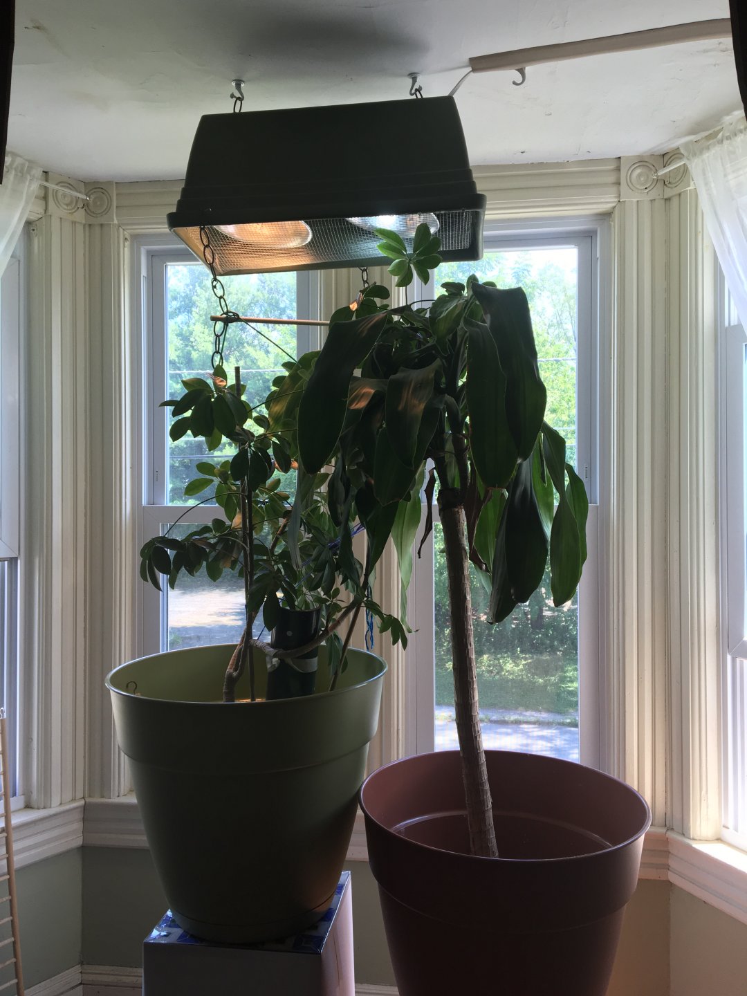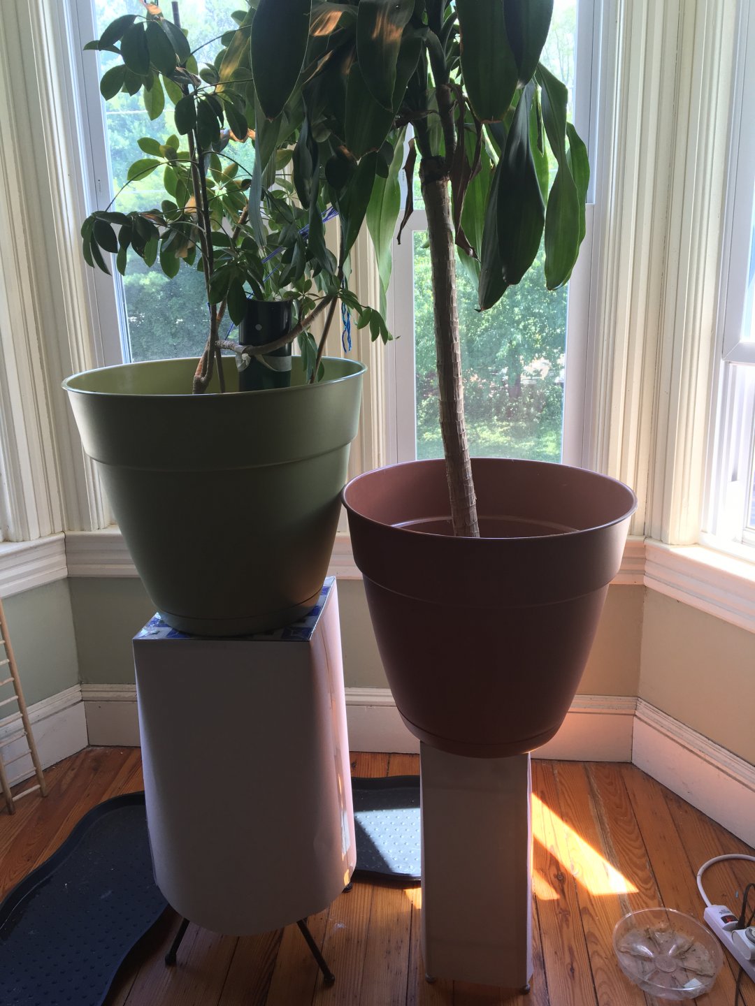 We have 2 large plants, set inside giant pots, elevated from the floor. Our inspiration for lighting was from Jann, and we hid them inside an upside down planter.