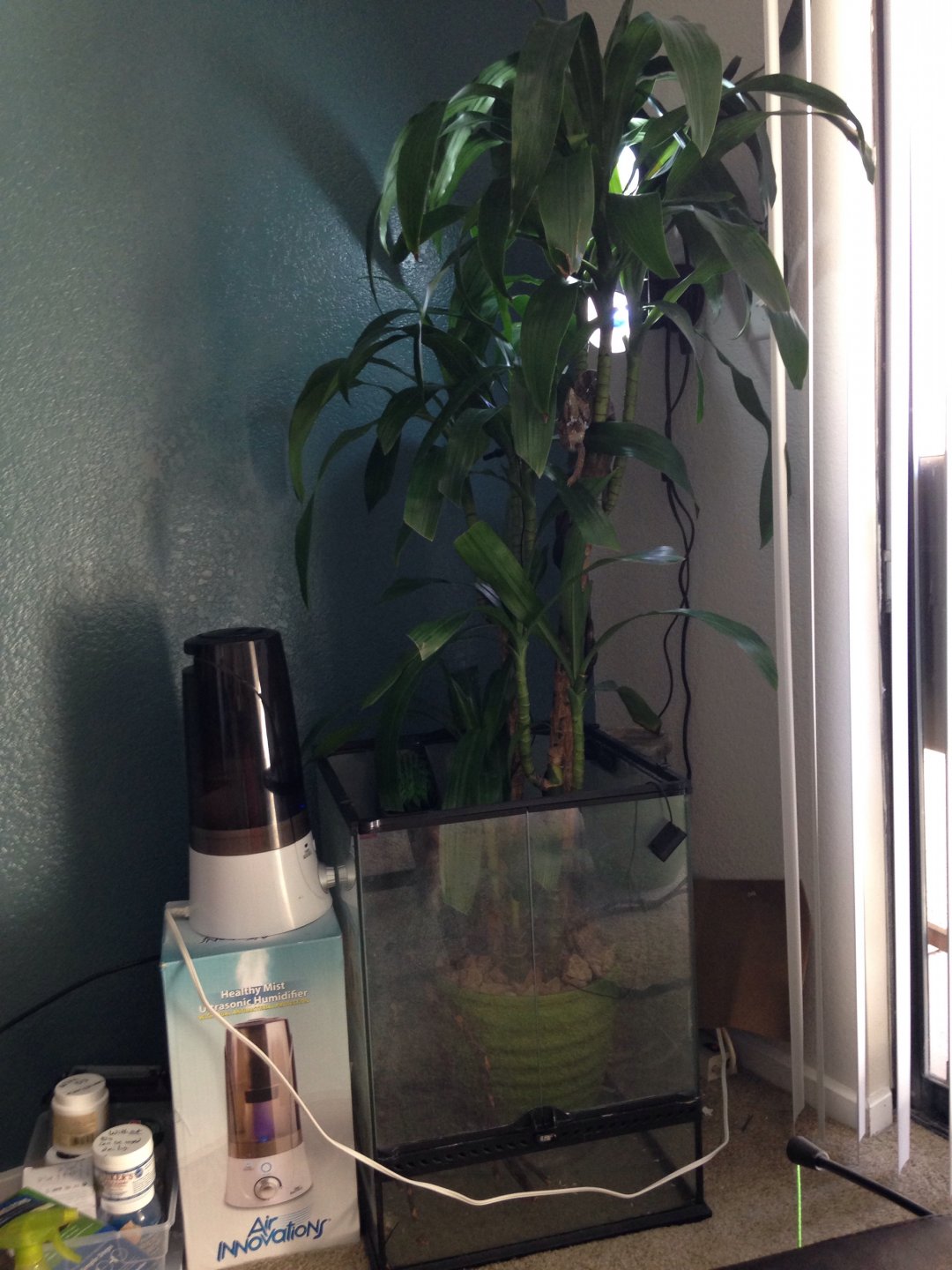The plants sit in our huge, bay window of our bedroom. I wrapped poster board around the bottoms of the planters, because we suspected he was able to climb down by hanging from his tail, but we're not totally sure.