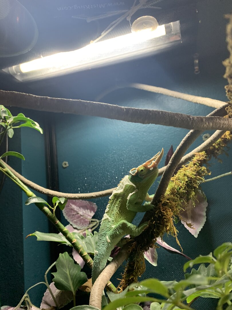 My friends husbandry is very poor. I try my very best to point him in the right directions, but he is very irresponsible and lazy (Not the typa person that should own a chameleon IMO). He does use t5 HO linear uvb lighting, but I recently found out the bulb is old and is probably not doing anything (I have yet to check it with my solarmeter). Who knows how long that uvb lamp has been out for. He does fog and use a mistking, and has the correct basking lamp. He used to not supplement AT ALL, but I have introduced him a proper supplement schedule of D3-free calcium twice a week and repashy lo-d once a month