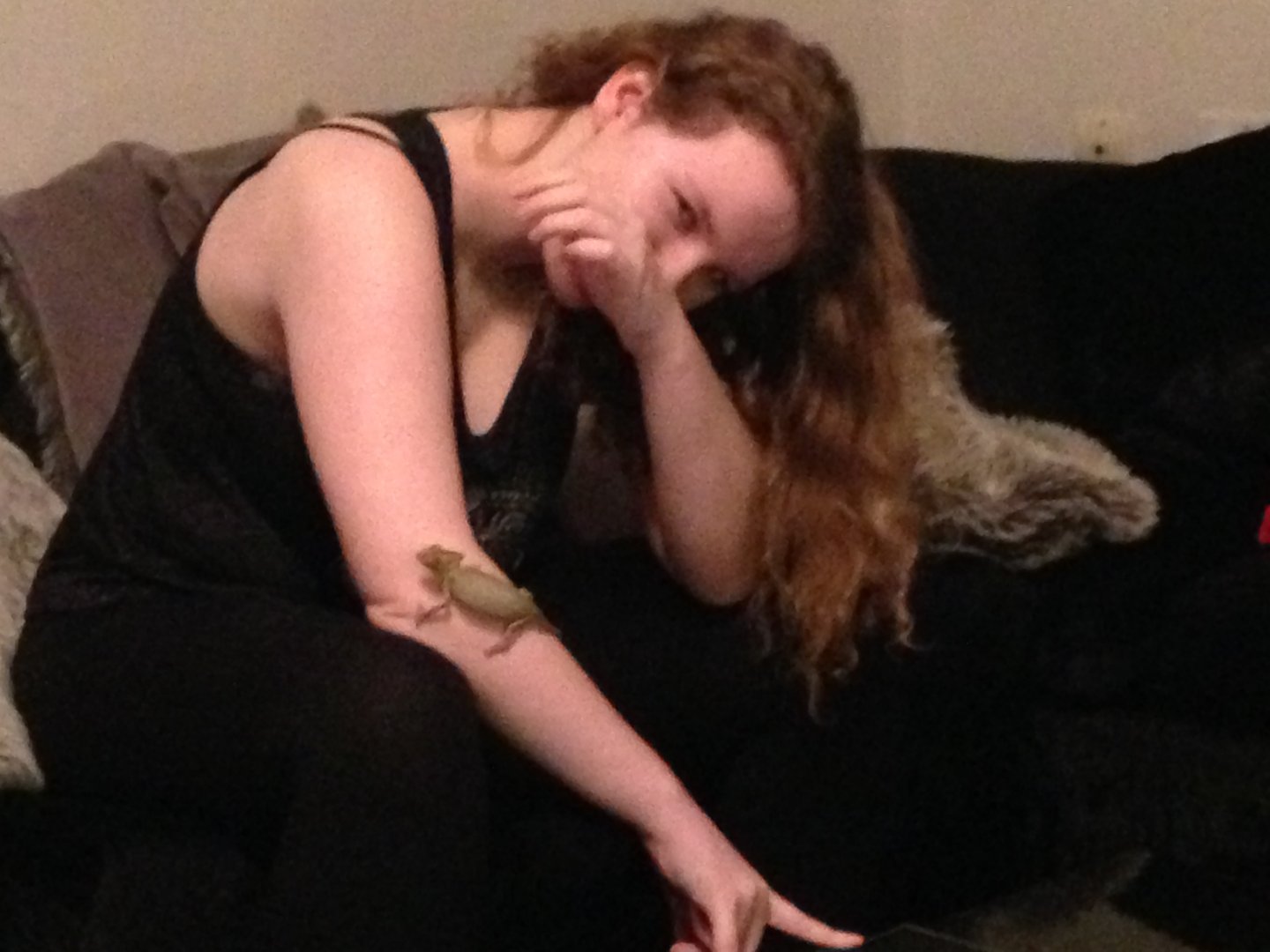 I give her a bowl with about 10 mealworms and some salad leaves and fruit or vegetable pieces in the morning (she most often picks out only the worms, and occasionally I also add a couple of wax worms which she loves particularly), and in the afternoon I give her about four or five small locusts or crickets. She always eats everything up that moves, no matter what numbers I give her