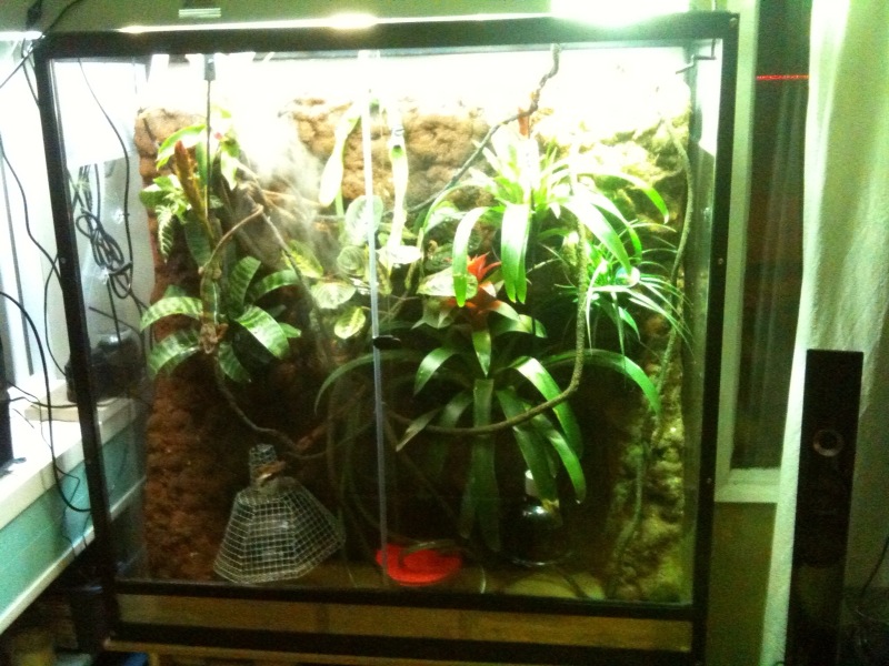 Keeping his Humidity at 80% at the middle of the tank which lowers at the tap of the tank. The tank is misted four times a day, and have a fogger running all day, Using reverse osmosis water.
