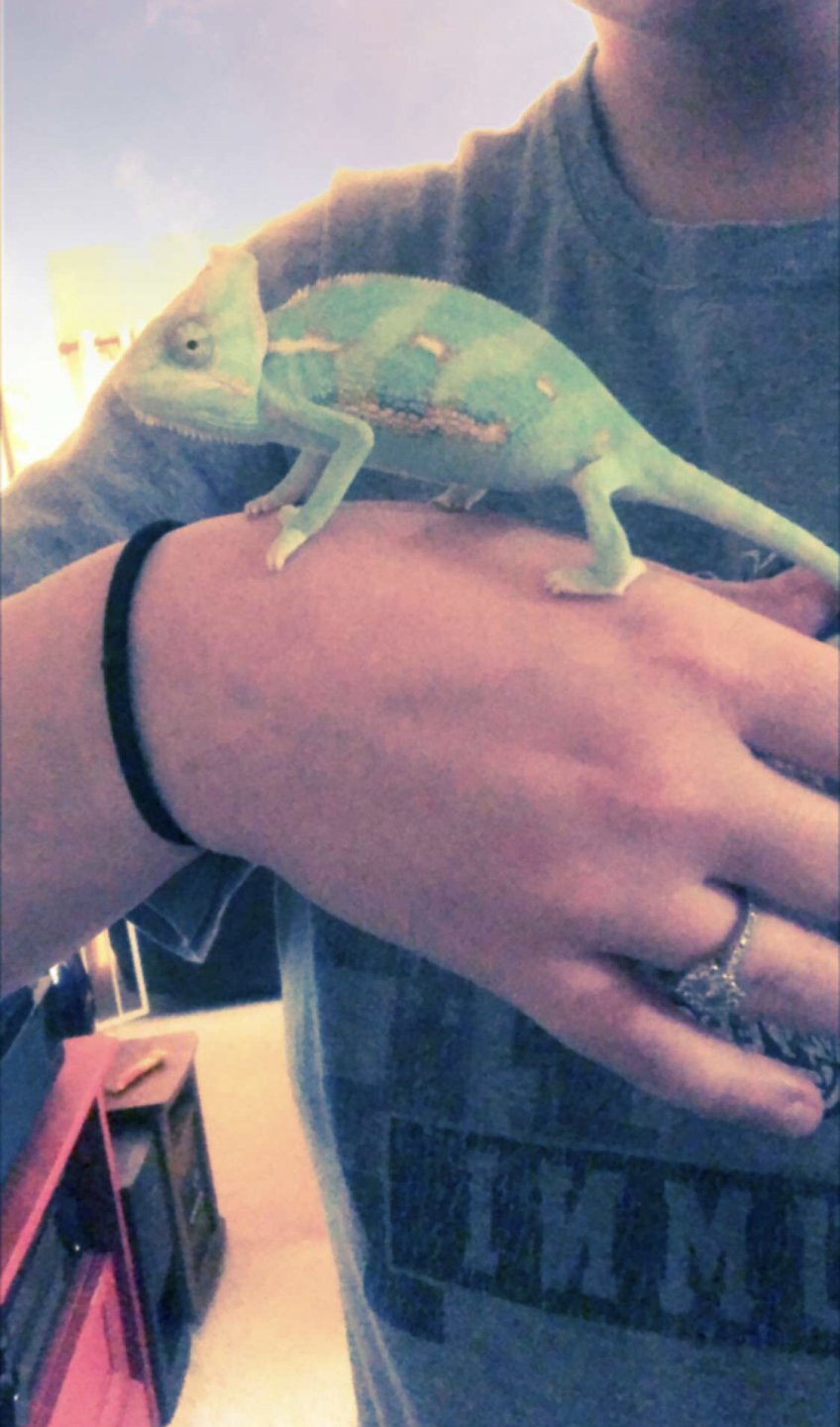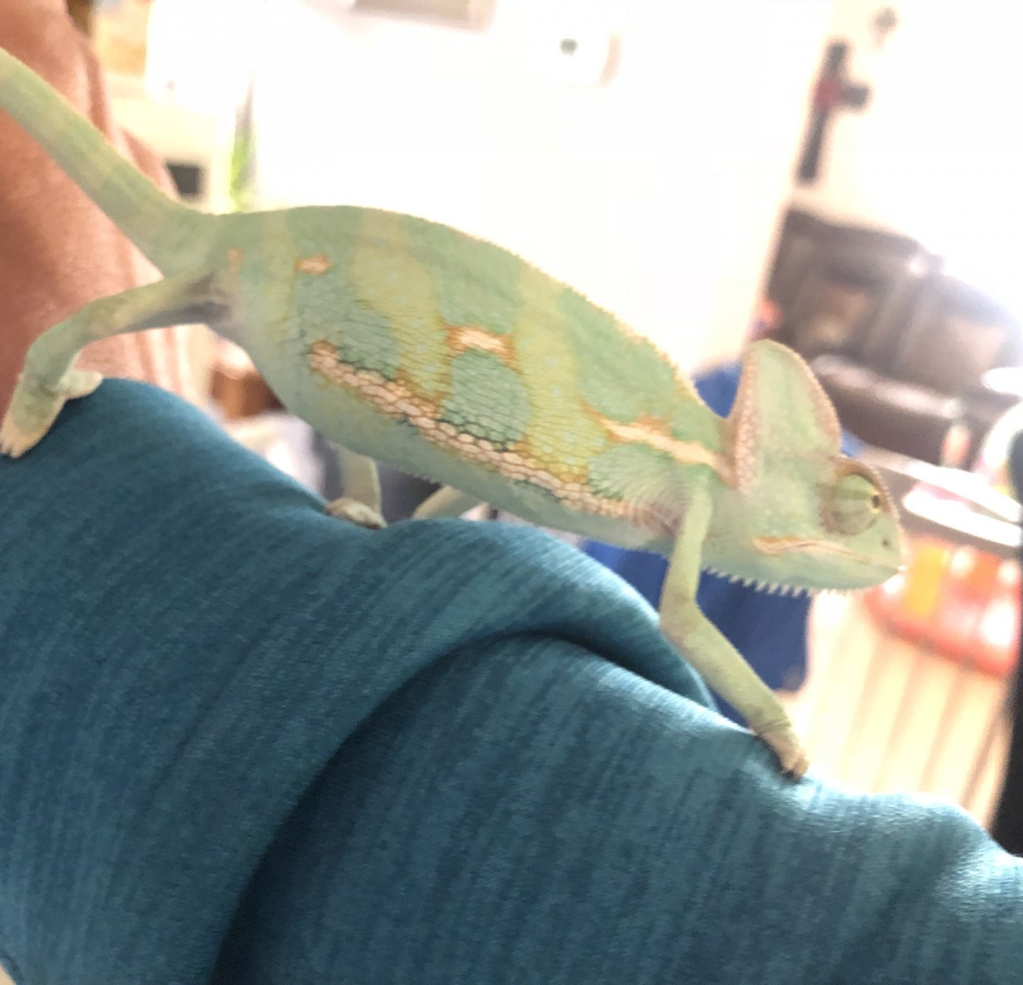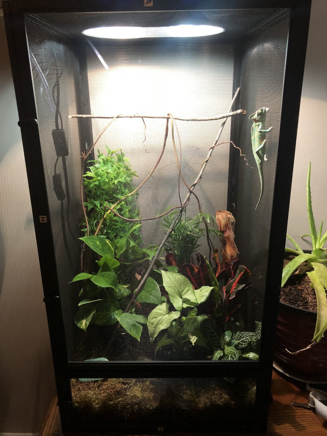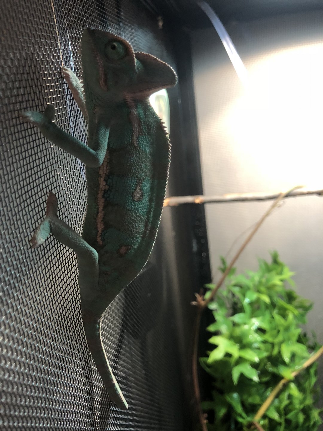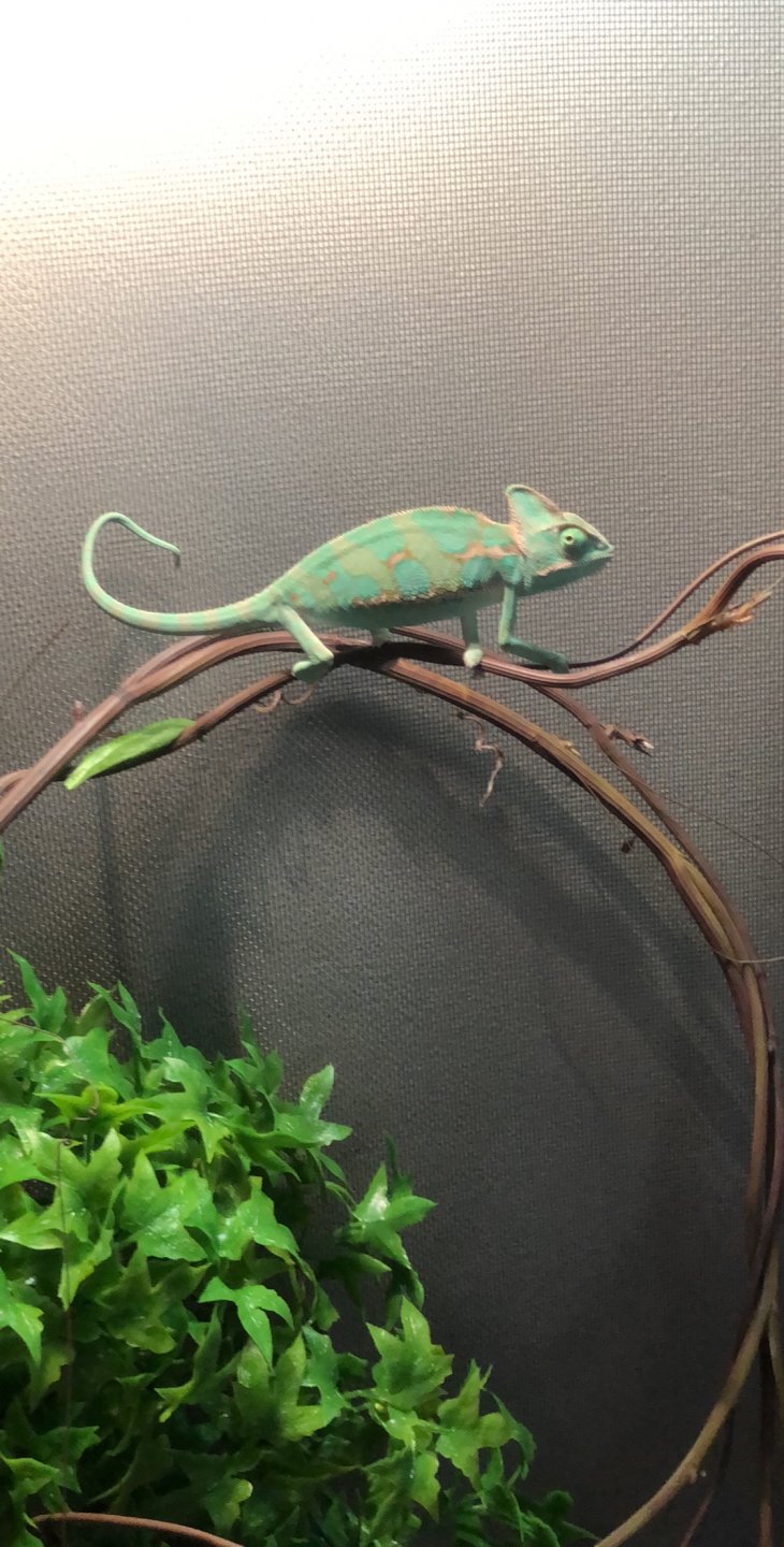 hi guys! I just got a veiled chameleon this week and I have some questions. First, I believe this is a male because I think I’ve spotted a spur and his colors are quite vibrant. He is nine inches long..any guesses on the age? And what do you think of my setup? I have two fake plants and five real plants, some moss rocks and branches.. and a home made drip system set up. I spray the cage three times a day. Any recommendations or comments on my little dude? Thanks!