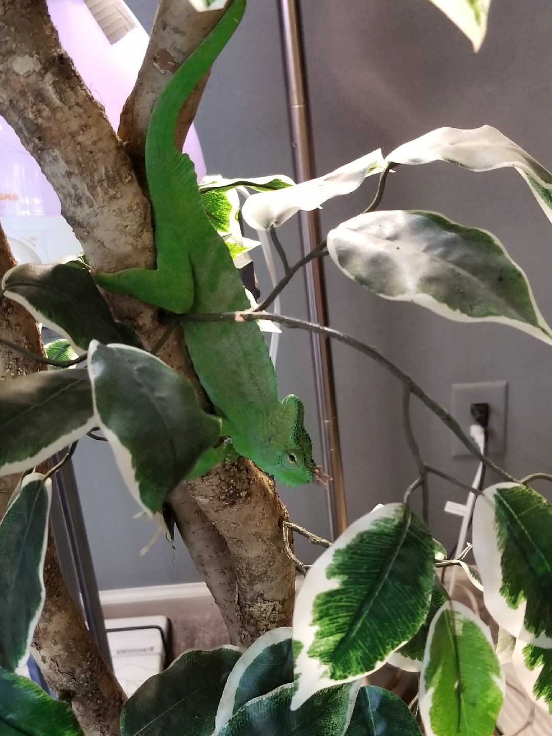 • Watering - Mist King set up. 1 hour after lights on for 5 minutes. Mid day for 2 minutes. 1 hour before lights off for 4 minutes. Also use a humidifier overnight, and when we are using the AC/heat, or have a fire going in the house. I very rarely see him drink. He just lets the moisture collect on his horns and opens his mouth a couple times.