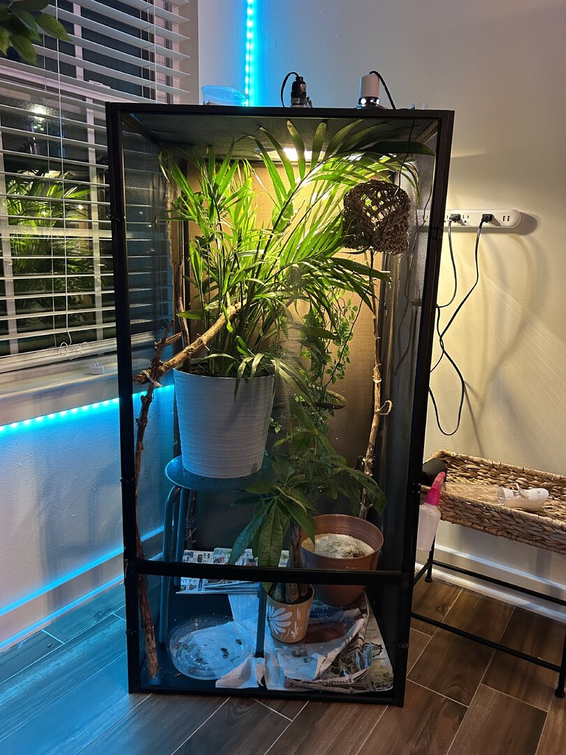 The Cham is in the zoo med 24x24x48 with good plant and wood structuring. Proper uvb and heat plus space heater as needed. Hydration is good with daily and nightly misting.
