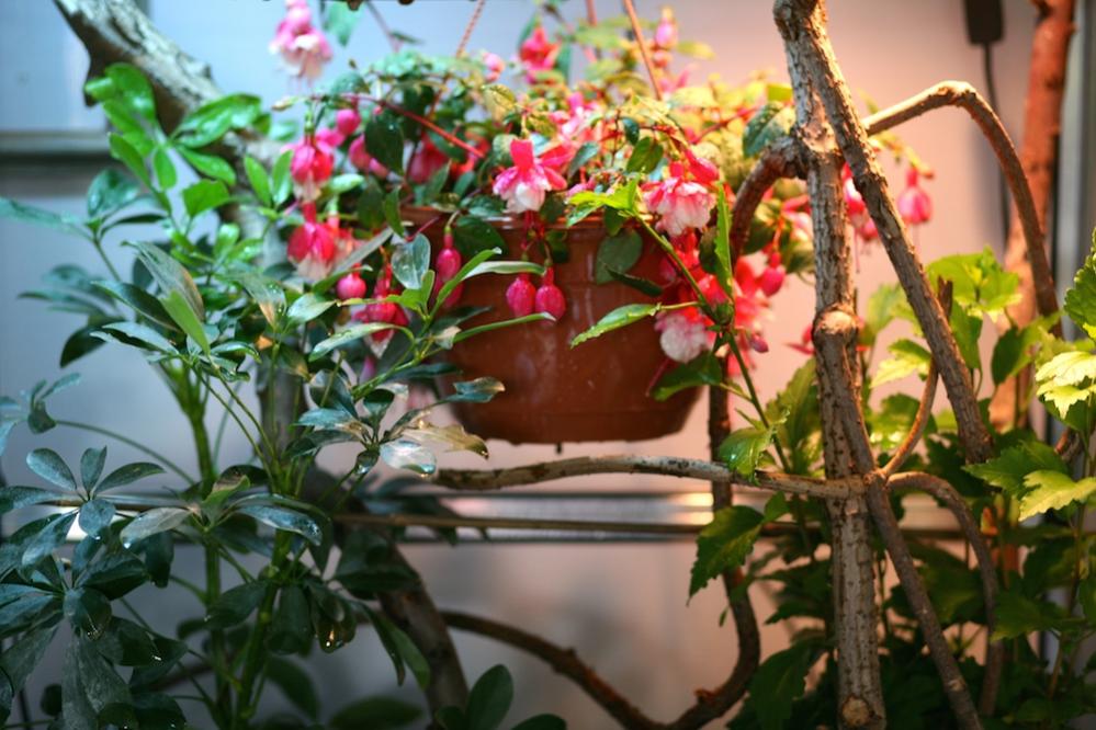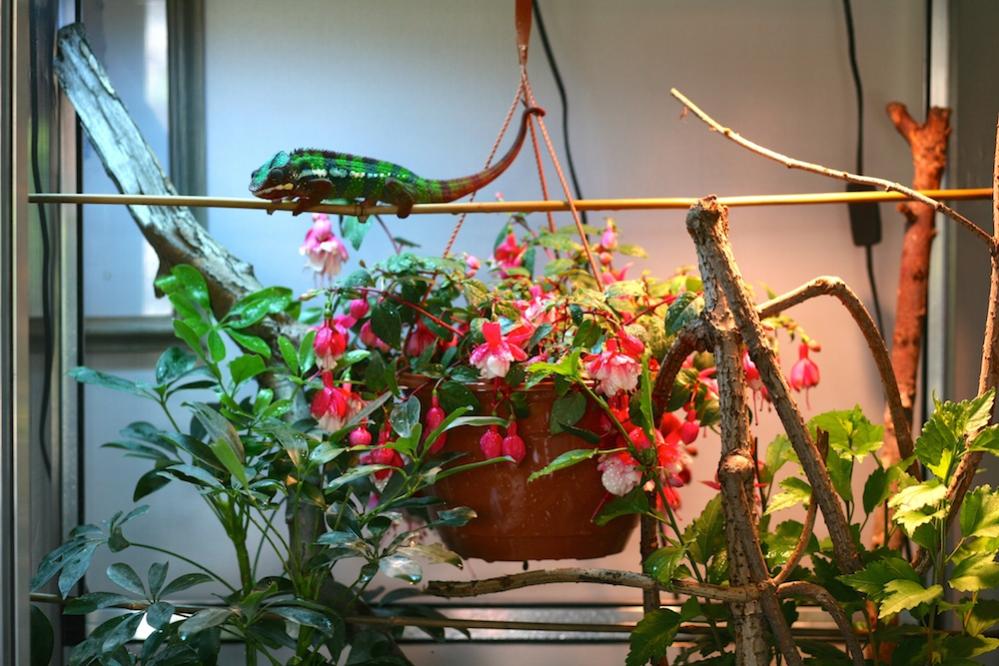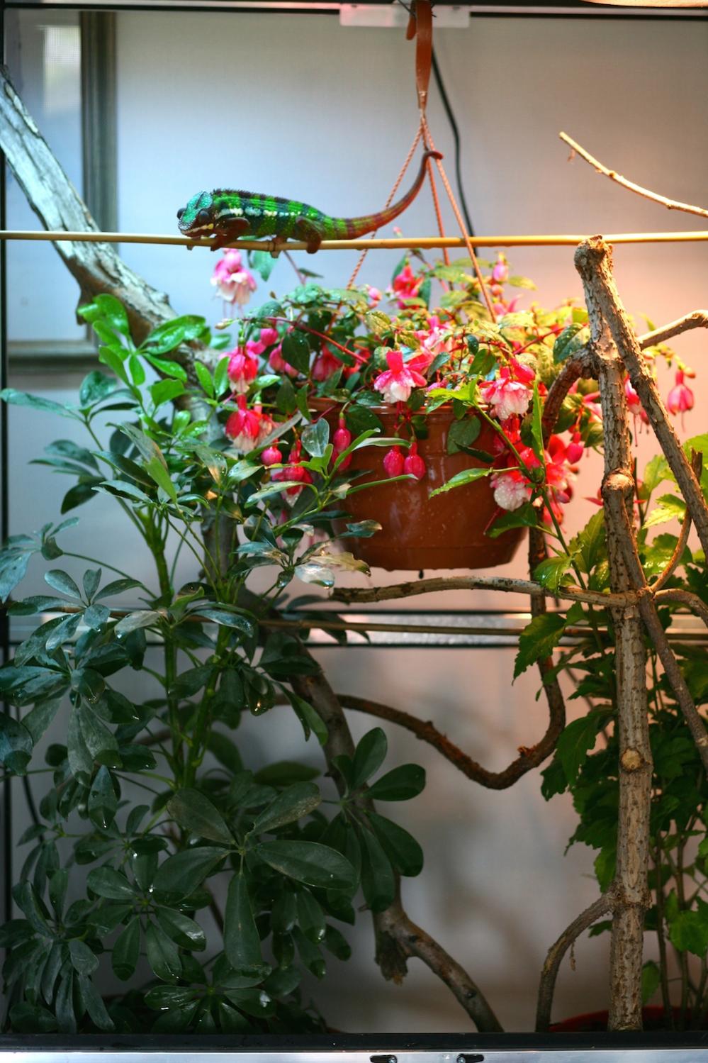 There is an umbrella plant, hanging fuchsia and hibiscus, and all natural wood/bamboo. I'll add more pathways later on today once he's a little more settled.
