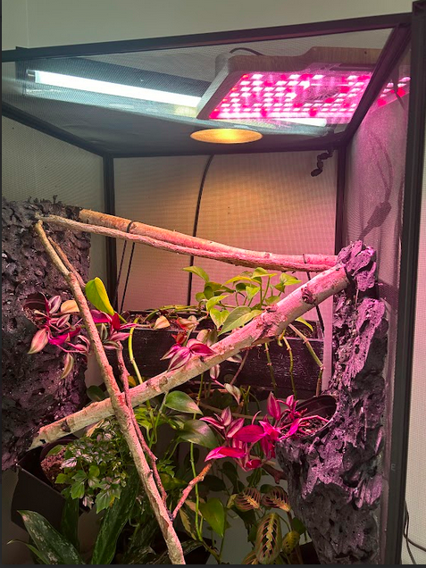 Let me provide you with all the specifics of my setup, in case you need them. My chameleon's enclosure measures 24x24x48, providing the minimum for his species. I have carefully selected various plants to create a natural and stimulating environment for him. Additionally, I have installed a zoo med reptisun t5 light to provide him with the necessary UVB rays for his overall health and well-being.
