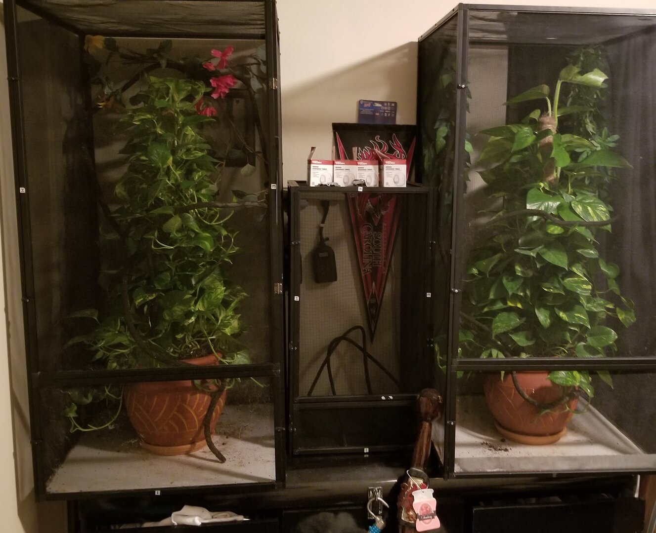 Hey, I have two Chameleons that I am looking to find a new home for. I have recently put up an ad on Craigslist for the male and a separate one for the female but I have only had one possible buyer. The only other ideas that we have is an event coming up in March 2020 in the Fort Lauderdale Florida area that is able to collect exotic animals from people but other then that we have no ideas. I’m not sure how we are supposed to find a place for these animals, it has become to much with our changing lives and faster schedules and everything but I don’t know where we can drop them off or sell them. The only other idea that I have is calling some local reptile shops to see if they would take them in but I’m not too sure. Anyways, please help if you have any safe and humane ways to rehome the chameleons let me know, I have been searching all over the internet. The top one on my arm is the one and a half year old female and the other chameleon on the red wire is the male at under 1 year