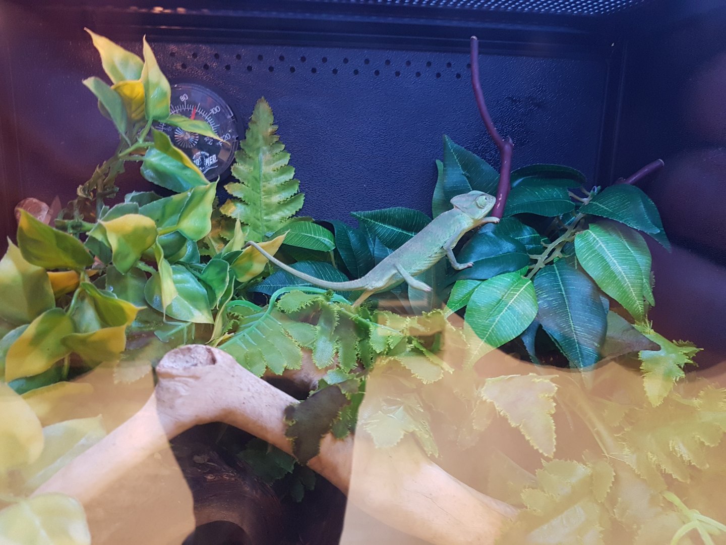 I am looking for a male veiled, and they are hard to buy in my area, except through the mail. The local pet reptile expert in my area has no access to Veiled's at the moment. One pet store that I can find has this little guy (pictured), but the first time I saw him he was gnawing on one of those silk plants. As you can see, that silk vine is completely chewed up on every one of it's leaves. I don't know if he did that or if they are not feeding or watering all of their past chams. enough and they all contributed to it.