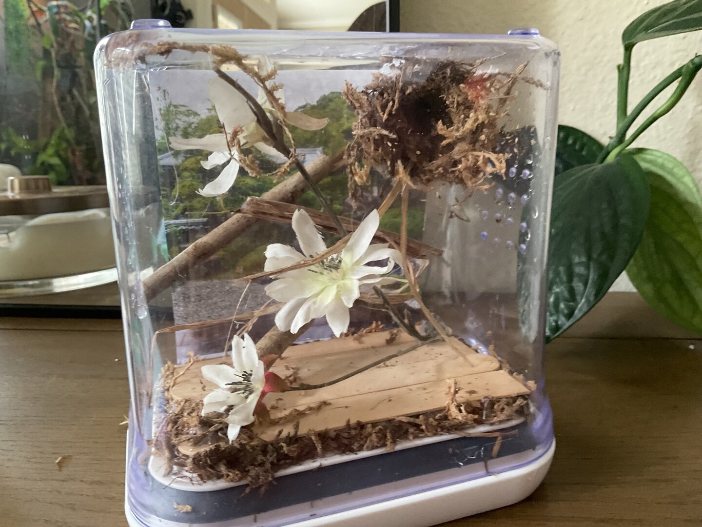 I took a dog treat plastic container. I then used a hot glue gun to just melt little air holes into the top and sides. Then I took sticks and sphagnum moss. I made her a little nest using a plastic thing and sphagnum moss.