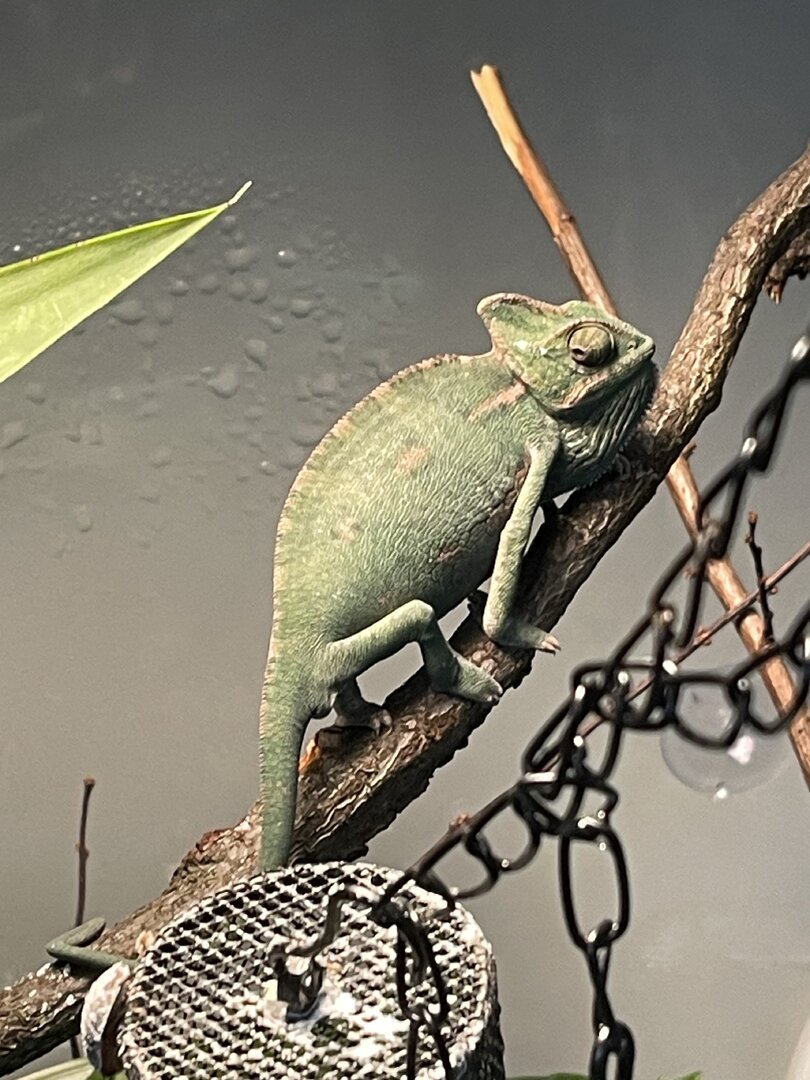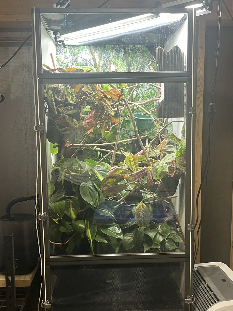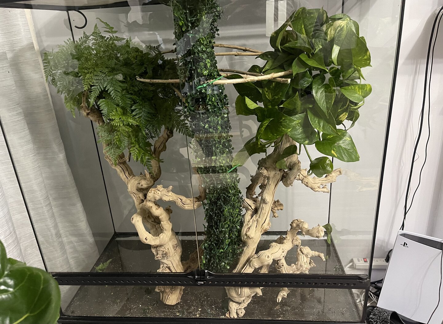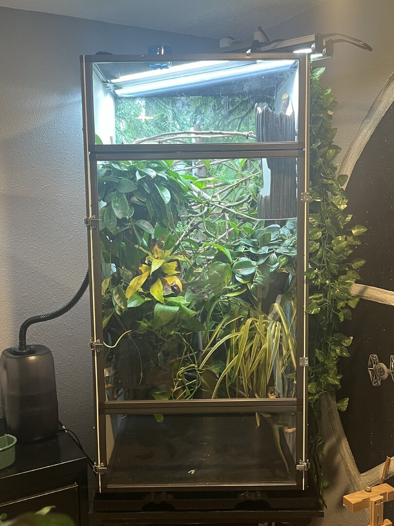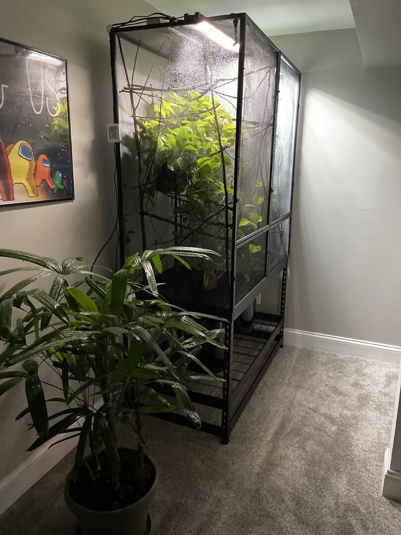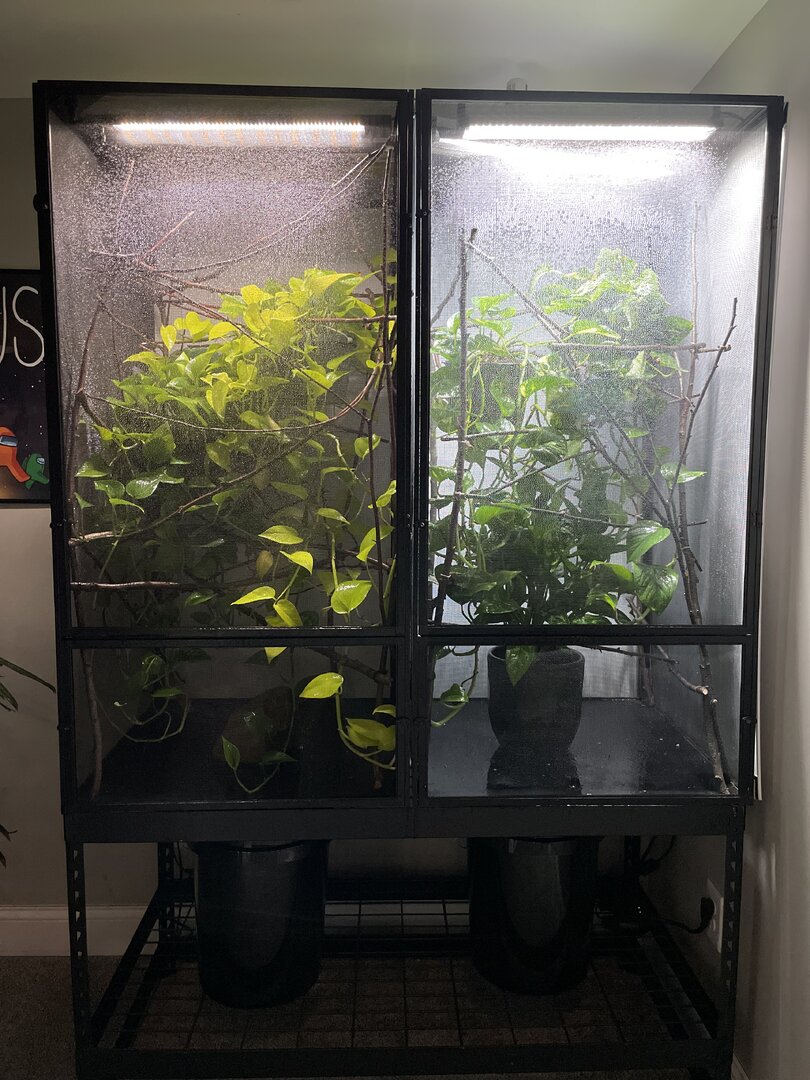 Background - Went down the chameleon rabbit hole. Got a veiled (3-4 months) and got addicted. Now a month later I bought a 36(L) x 18(W) x 36(L) Exo terra hybrid cage and split it down the middle to house two chameleons. Im getting a panther baby 3-4 months). Good or bad idea. Not really interested in hearing that glass tanks are not good. These are exo terra ones with vents and mesh for airflow/chimney effect. Anyway, pictures below. Can you review my husbandry please? It's obviously work in progress. Willing to hear any suggestions to give these chameleons the best life I can. I do care about aesthetics btw. I won't have a mesh cage in my living room.