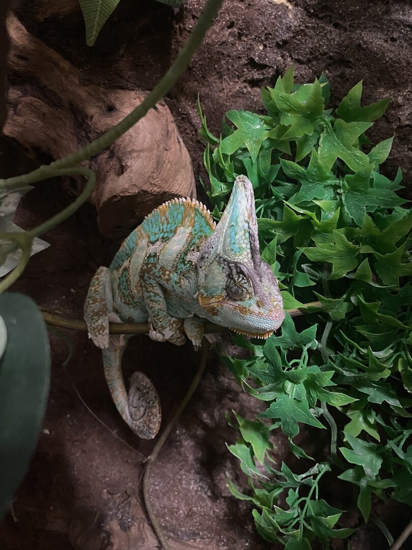 I also attached a photo of my enclosure; there used to be a yucca plant filling out the bottom of the enclosure but it died while we were moving recently and I haven’t decided what to replace it with. Accepting suggestions for tall, chameleon-safe plants that are easy to keep alive.