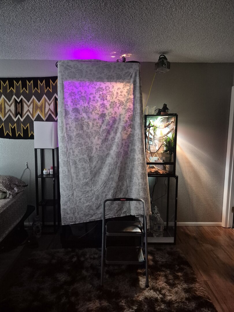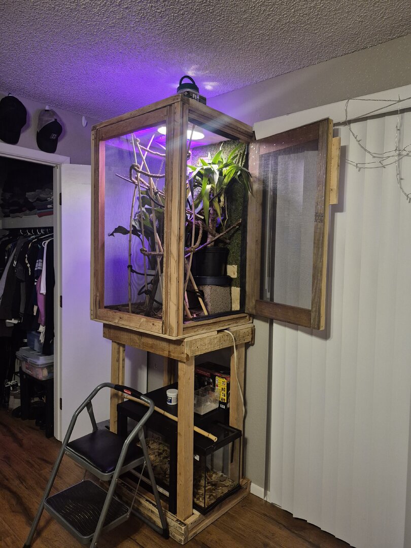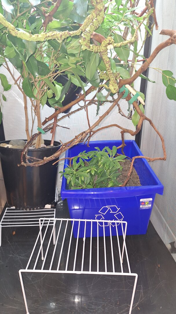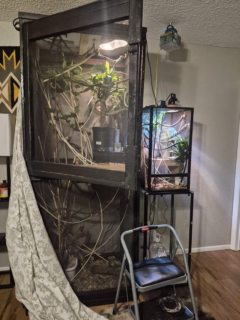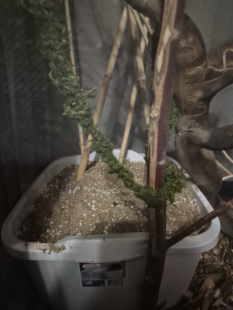 We have a 7 foot screened enclosure. The temperature is at 80 and humidity is around 60 to 64. We have a 6 to 8 inch opaque lay bin prepared. Substrates are 50 play sand and 50 perlite (vermiculite). We covered her entire enclosure with a sheet for privacy. She has been eating normally. Her crickets and cockroaches are calcified. The lay bin is 2 ft x 1 ft big.