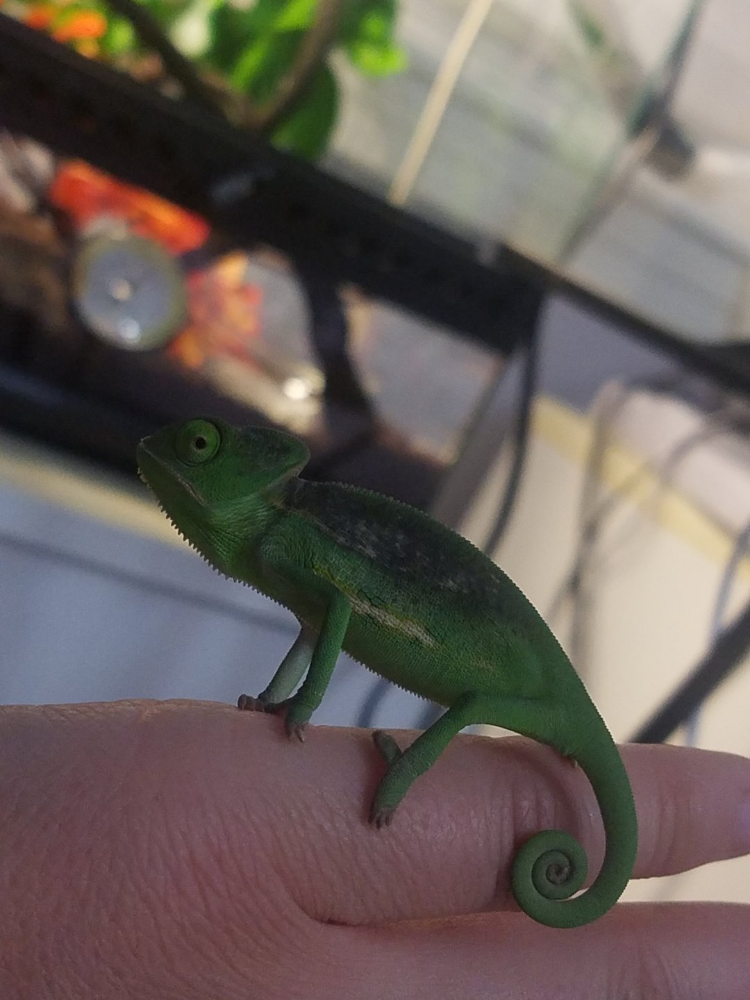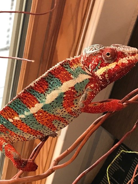 Other things potentially related - I changed his UV bulb right before I left, and it is right next to his basking lamp, which he is spending more time under. Also, I have an auto-mister that comes on twice/day for 7 ½ and 2 ½ minutes, but I have been letting him spend whole days free-ranging across some branches I hung from the ceiling (he loves it!) with no water, so maybe he is dehydrated?
