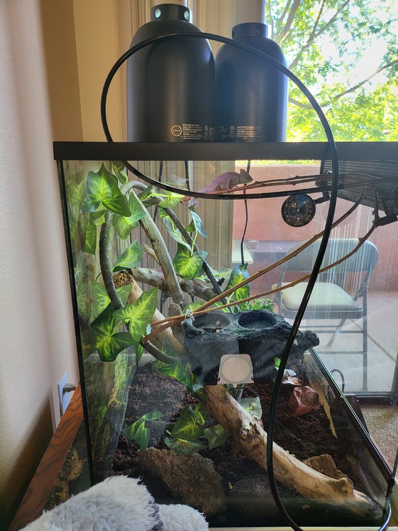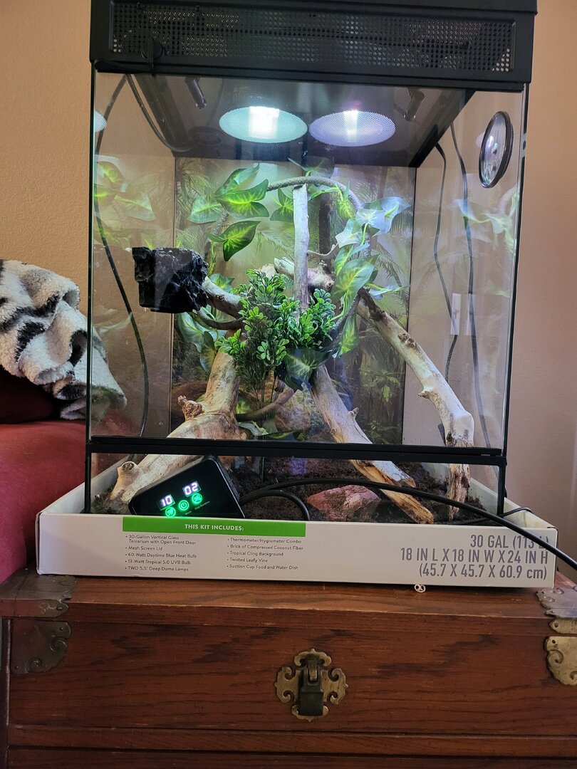 @Beman has another way with adding acrylic panels that she can tell you about. However you do it, the minimum size needs to be 2x2x4’. I encourage doubling that if able. You want to fill up the enclosure with safe clean live plants, like pothos, weeping fig, tradescantia zebrina, schefflera and others. This is a great guide for plants. Our veiled friends like to eat their plants, so look for the ones marked ‘veiled tested’.