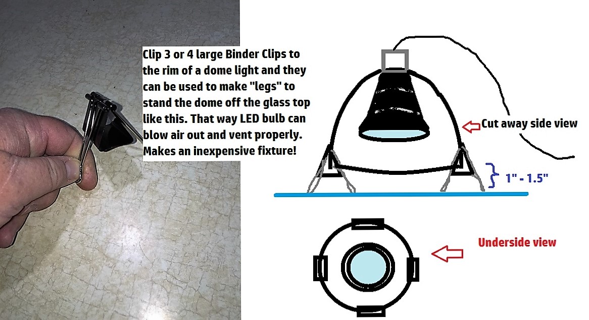 Also thanks to a customer, we have a neat way to raise them up an inch or two off the screen top of a cage using a deep dome reflector and med- large binder clips.