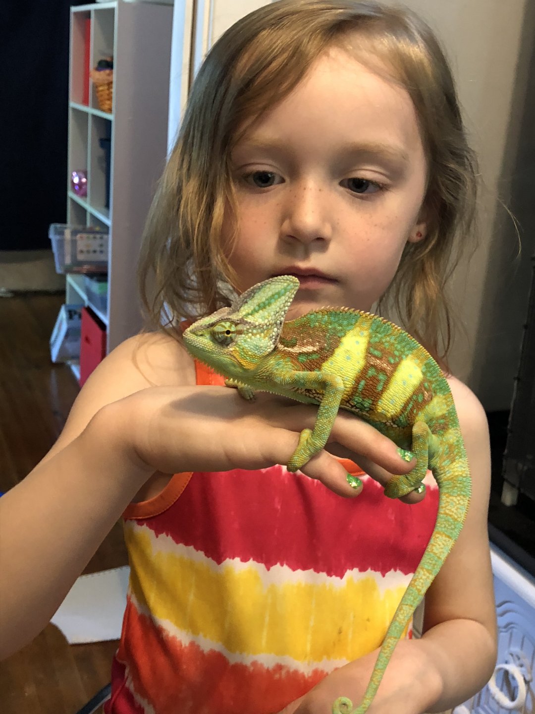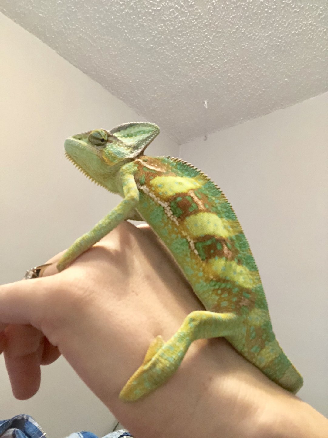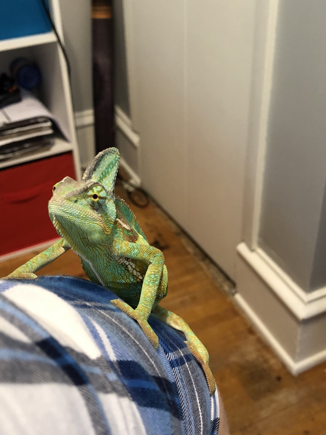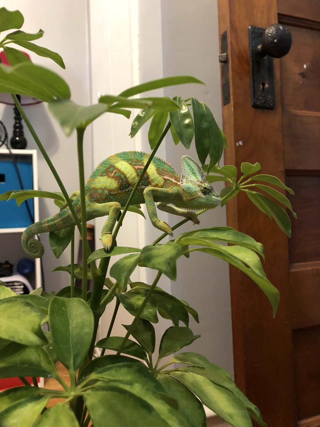 He loves his crickets and is very eager about eating silkworms. He used to eat superworms too but had stopped eating them in favor of the silkworms. He is very aggressive toward anyone who puts their hand in his cage but once he’s out, he’s great. I’ve been working on positive association by leaving his door open when I enter the room and feeding by hand. I wait for him to come out onto his door when he’s ready so he doesn’t get so dark and puffy at the appearance of my hand. Once he’s out on his door, he usually will just climb up on my hand. I have a few plants for him to hang out in but the hibiscus is his favorite.