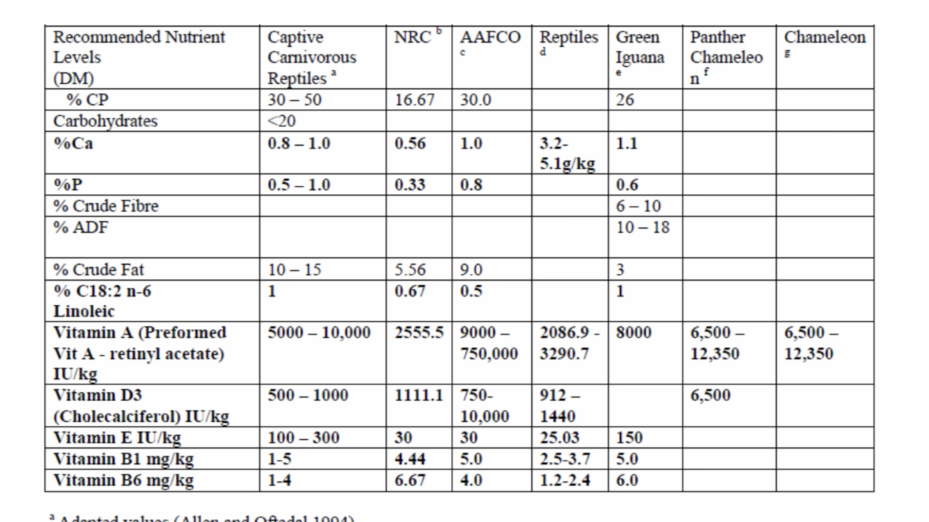 The column for chameleons is essentially blank due to the lack of data regarding wild diet and it’s nutritional value along with lack of research on their requirements.