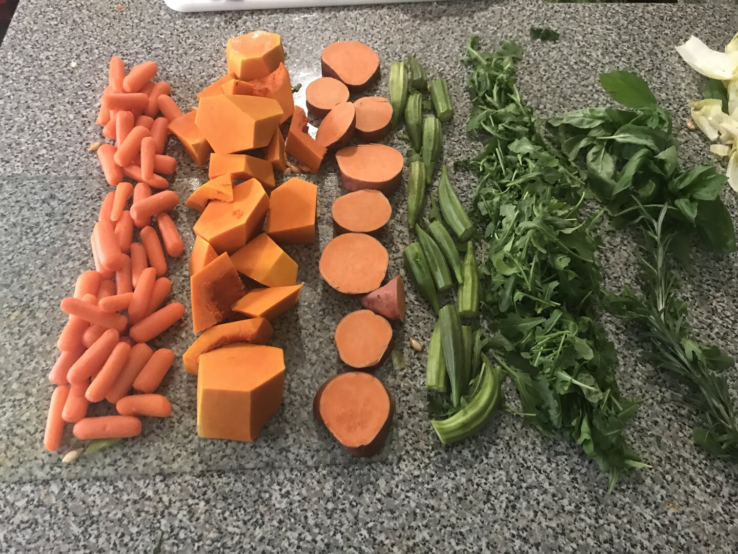 Pic 1, left to right: carrots, butternut squash, sweet potato, okra, arugula, basil, rosemary