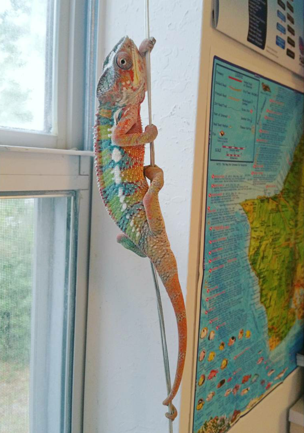 I spray him down with warm water daily, feed him around 9am with crickets and have several calcium powders that I schedule throughout the week/month directly from Bruce at Chameleon Paradise. About two weeks after he arrived I had to make a long long drive a few states away and read extensively on how you should transport a chameleon. Went to the local petsmart and got a smaller sized plastic reptile enclosure, and got him some branches to hold onto and lined the bottom with a hand towel just in case he fell off one of the branches. While in transit I covered the cage with a dark blanket (making sure he had some kind of ventilation to breathe) also taking along his entire cage, dripper, and lights (UVB and a ceramic heat emitter for night time) and also more live crickets. To get him in this smaller plastic cage I tricked him into climbing onto a dowel rod (this is key*) pulled it out of his big cage and guided it over to the smaller cage and we were set, only he did not like the small cage! He tried to climb out of it as soon as I stuck him on one of the branches, but as soon as we got out to the car, with the blanket over the cage he went to sleep.