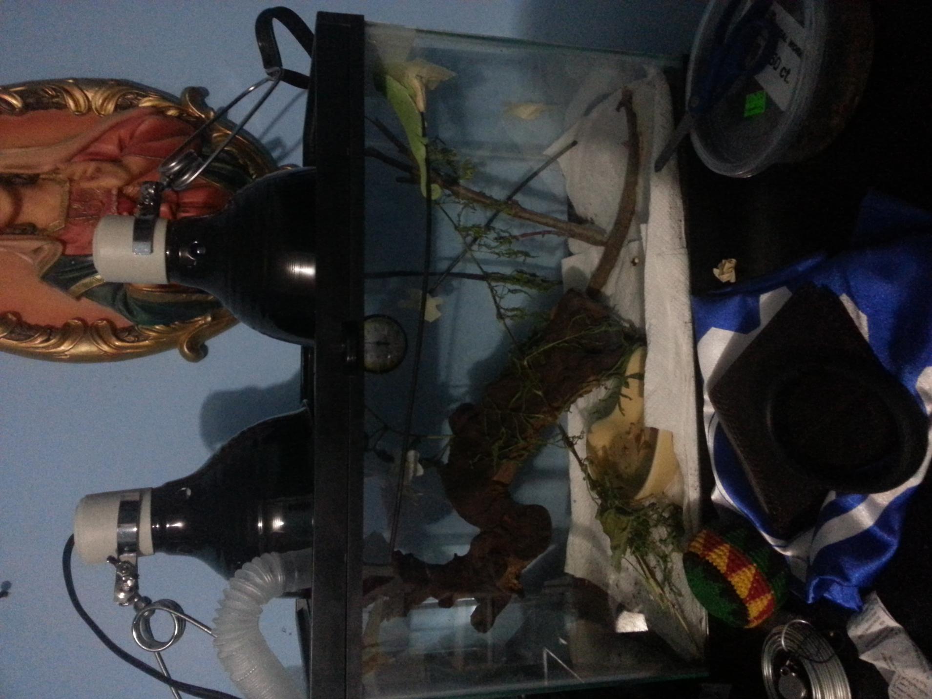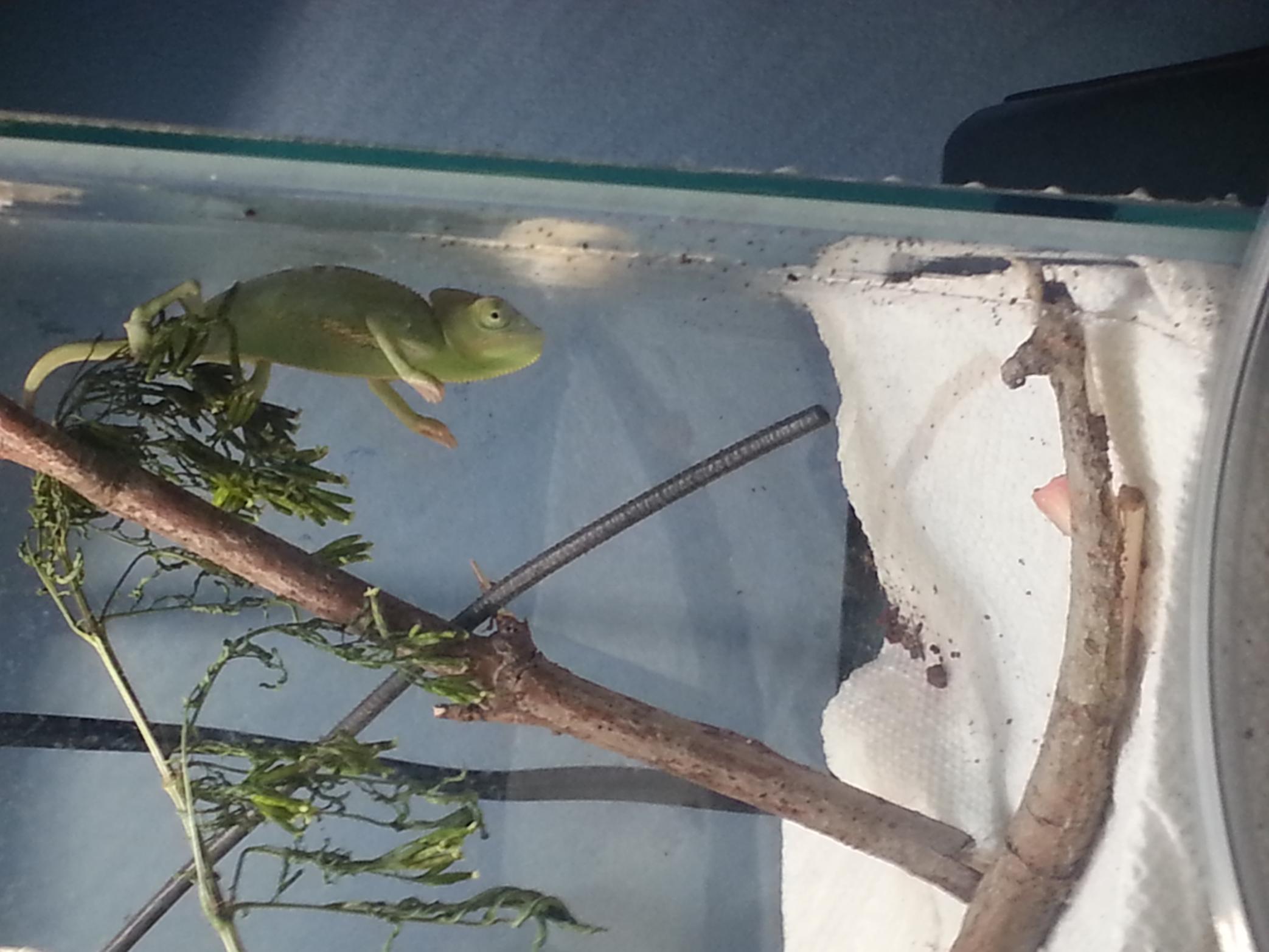Please read the attached care sheet on how to house a veild chameleon. Your cage is not adequate and needs to be changed. You need to search the enclosure threads to get an idea on how set up a proper cage. The fish tank you have him in is not a good habitat for him. You have your branch way too close to the lights an he is going to get burned.