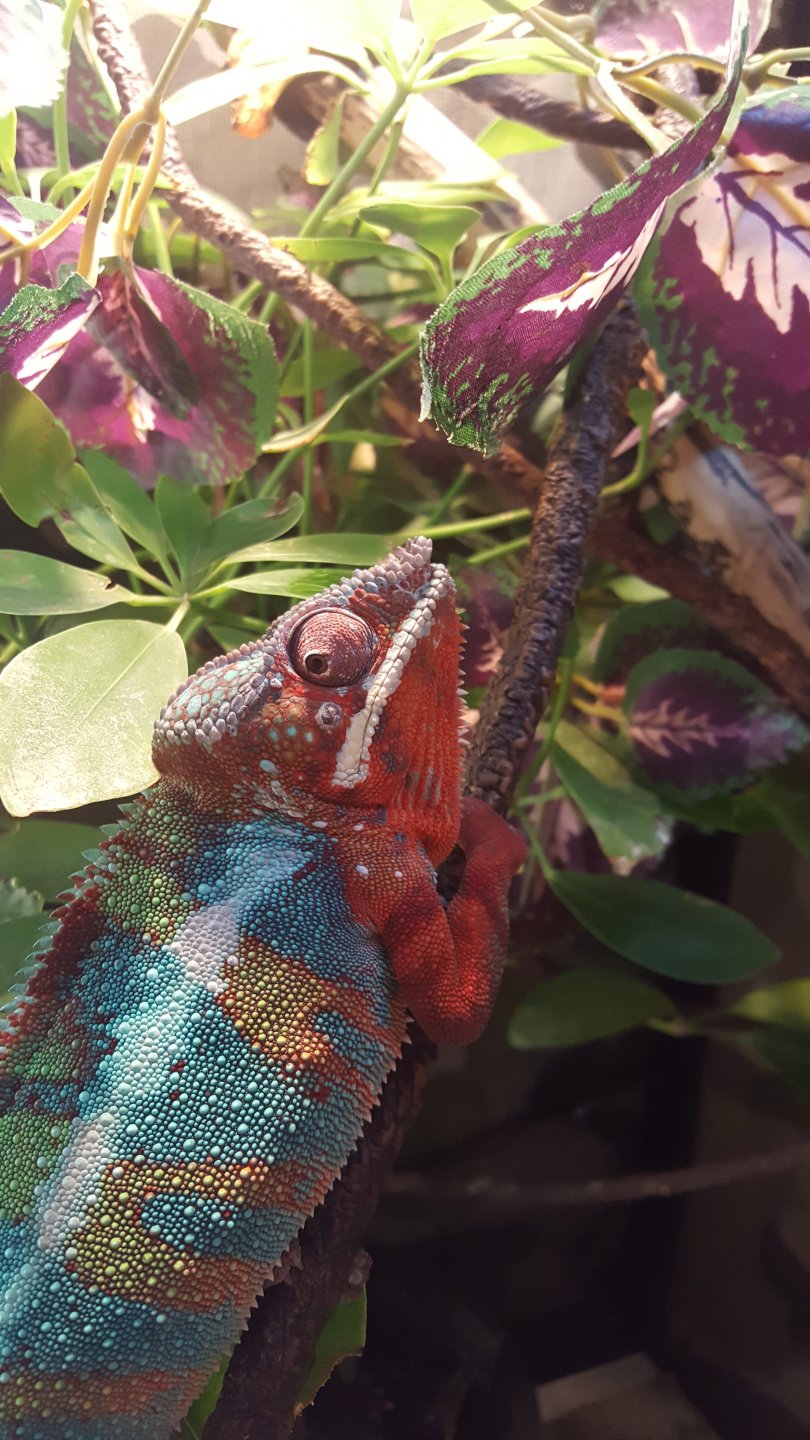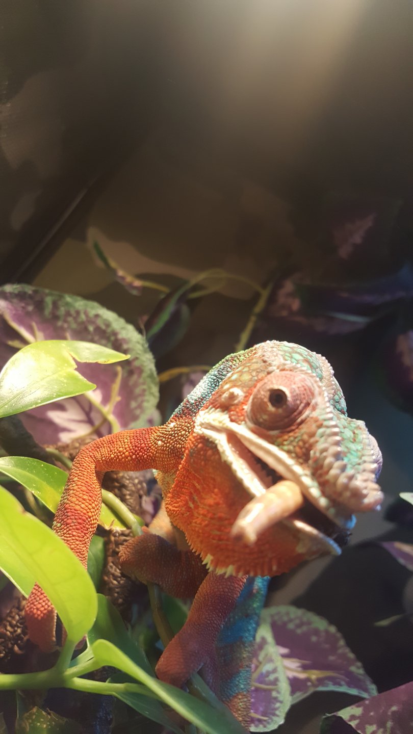 My panther chamelion is about 2yrs old. He just developed a small hard bump on his face. I noticed it after his most recent she'd. I have no idea what it could be. He eats well and moves around well. Diet of crickets and superworms with horn worms every once in awhile. Dust food with d3 mixed with multivitamin. Thanks for ant help. It's the bump under his eye. First pic is last week and one with worm in mouth is today. He finished his she'd last week