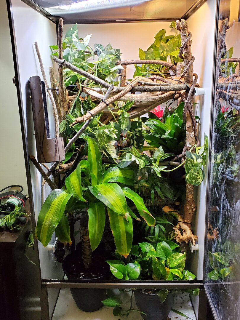 After vigorous shopping and cleaning and remodeling, and with more to come, I spent the weekend creating a new home for my chameleon son Harold. His cage before was so sad. I killed all the plants and he was living in a deserted house. BUT with the help of this forum and the links everyone had provided me, I have remodeled Harold's home into a jungle-like atmosphere! I still have work to go indeed, but this is a fresh start for my little lizard friend. Here are before and after pictures. I have decided to use Golden Pothos in his cage, since I have read they are very forgiving and easy to care for, and create great foliage! I am kinda stumped on how to weave more vines around all the plants, so help on that would be great. Opinions and comments are welcome and appreciated on how to make it even better! Thank you everyone!