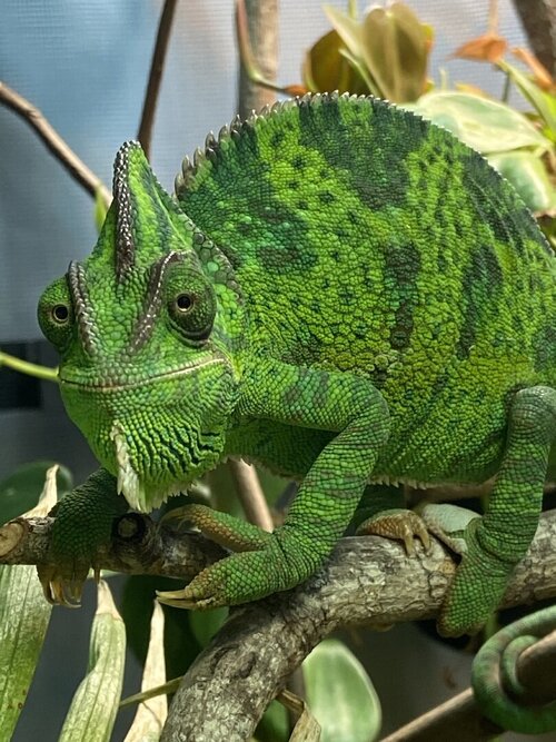 He’s still staying primarily shades of brown or gray (the pic above comes off a lot more brown than he really is. I’d say it looks like a very muddy green/gray vs a reddish brown), but I’m hoping since today he looked slightly more green we’re heading in the right direction! And I even noticed as I was checking on him before bed, that he’s starting to shed on his hind legs! Can’t say I’ve ever seen one start shedding on their back legs vs their body, but either way, here’s hoping he can shake some of the stuck shed on his face while he’s at it! Harder to see through the screen but I didn’t want to bother him too much since his lights had just turned off for bed.