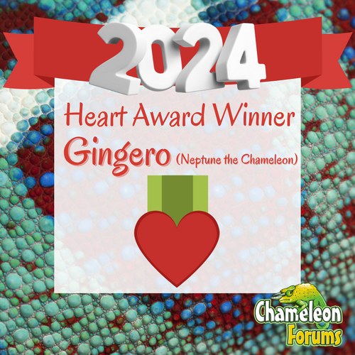 I am very happy to announce that Gingero (Neptune the Chameleon) is the latest recipient of the Heart Award at Chameleon Forums. Gingero joined the forums in 2018 where she quickly became an active and well-respected member of the community. Over the years she has dedicated a great deal of time to helping chameleons and developing educational resources for their owners. Her contributions to both the forum community and the overall chameleon community have been significant. Many people know her for the very successful YouTube channel she developed, Neptune the Chameleon.
