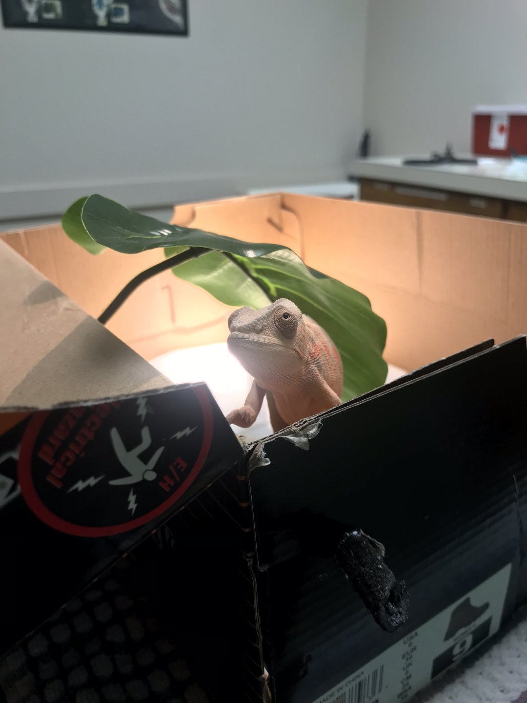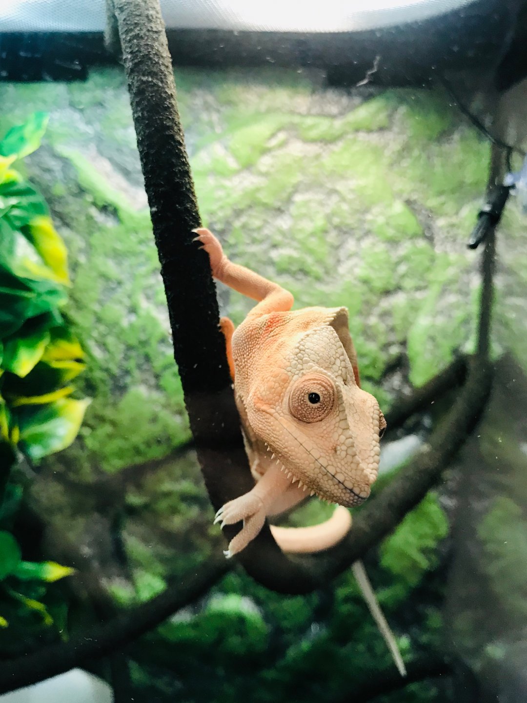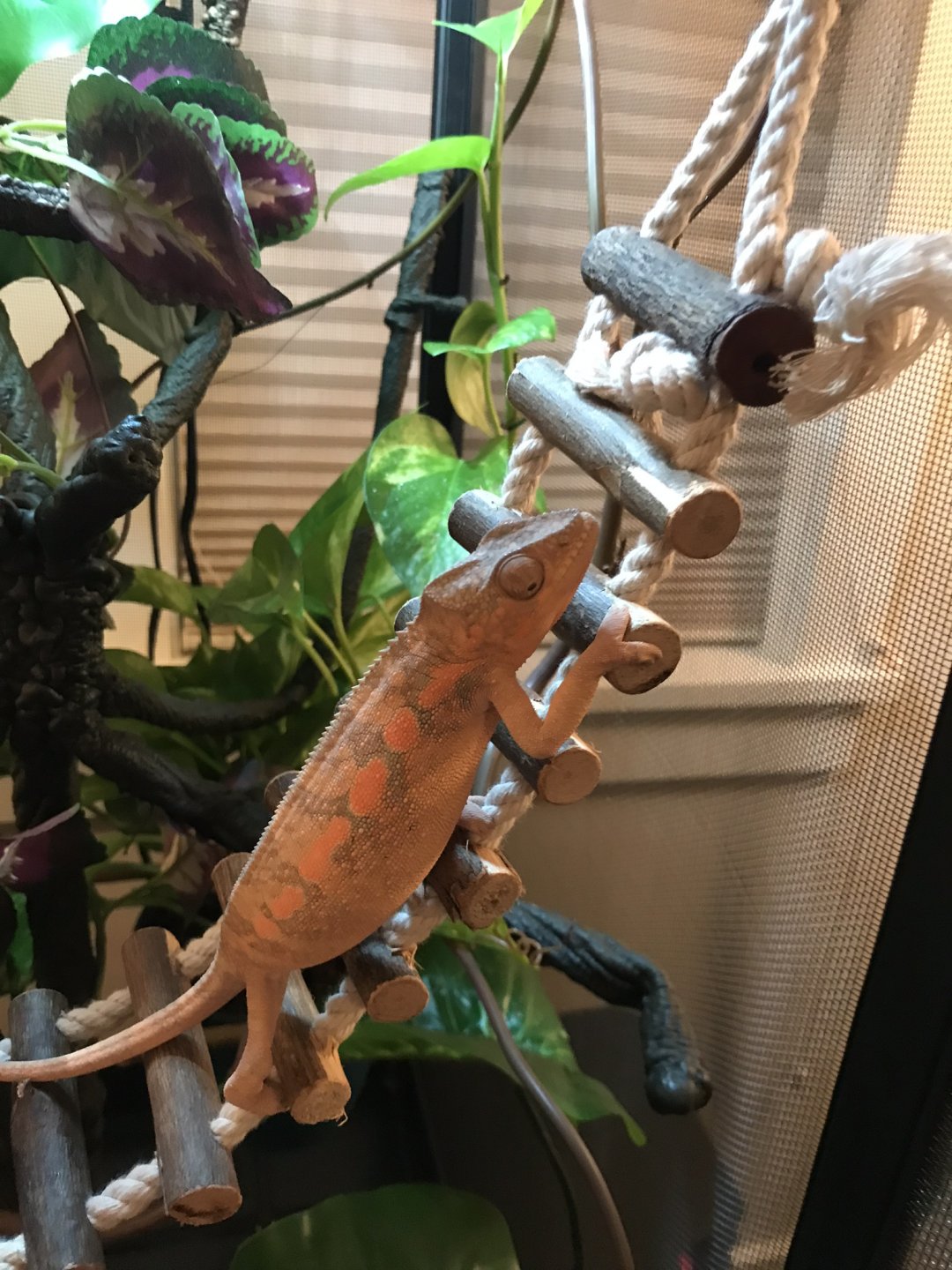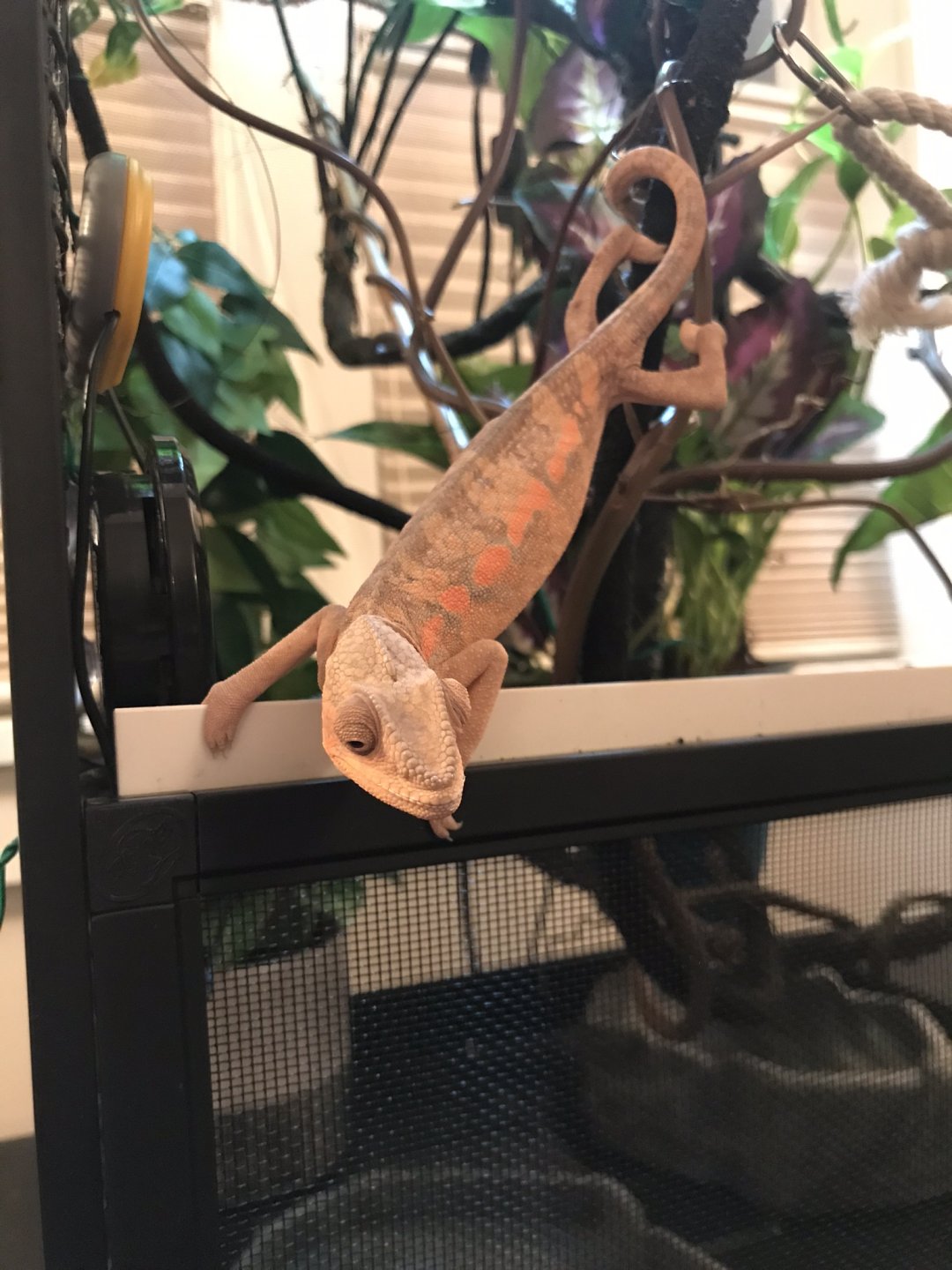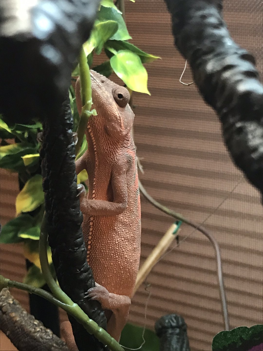 I just wanted to introduce myself (and my wife Kristen). We just recently brought home our newest family member: Peach! She's an adorable flush pink Panther Chameleon who we *think* is about 6 months old (if anyone out there has any different opinions on that based on her pics we'd be happy to hear them). She currently weighs 49 grams and is extremely social--she loves coming out of her enclosure unsolicited and hanging out on the WIP jungle gym we're constructing
