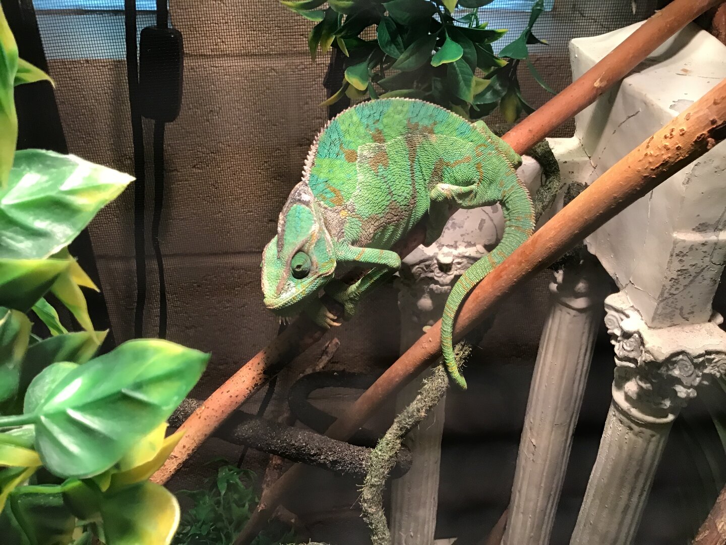 or (veiled Yemen chameleon F) Our chameleon has been not eating at all, she wasn’t moving but she has started a little. We have gotten her to eat a few leaves, but that’s about it. she also has these spots that used to be black but are now more white. Her eyes also seem very shrunken, and she sometimes seems like she is sleeping, when she should not be. we don’t know what to do and could use some help.