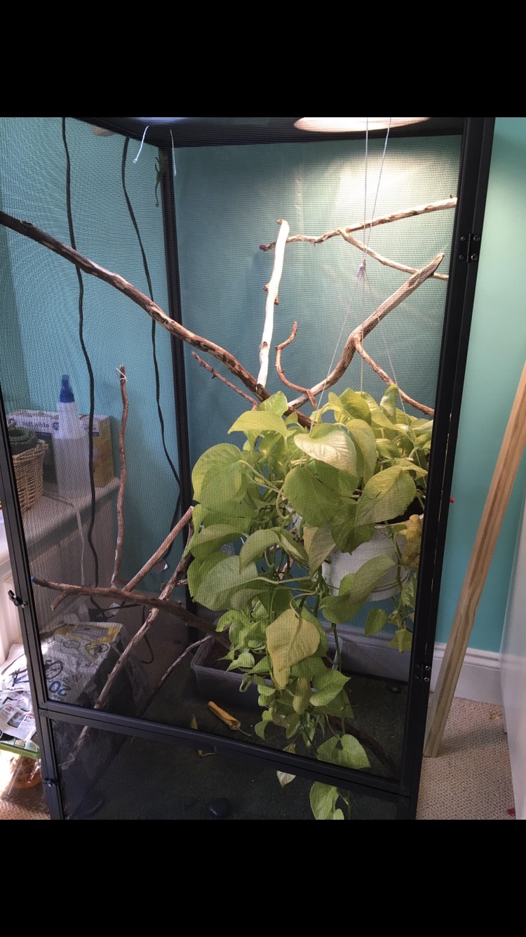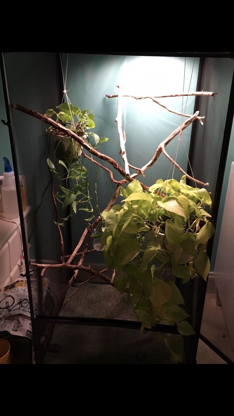 three pothos plants in organic soil. I would normally feed 5-6 crickets every other day and some meal worms now and then.