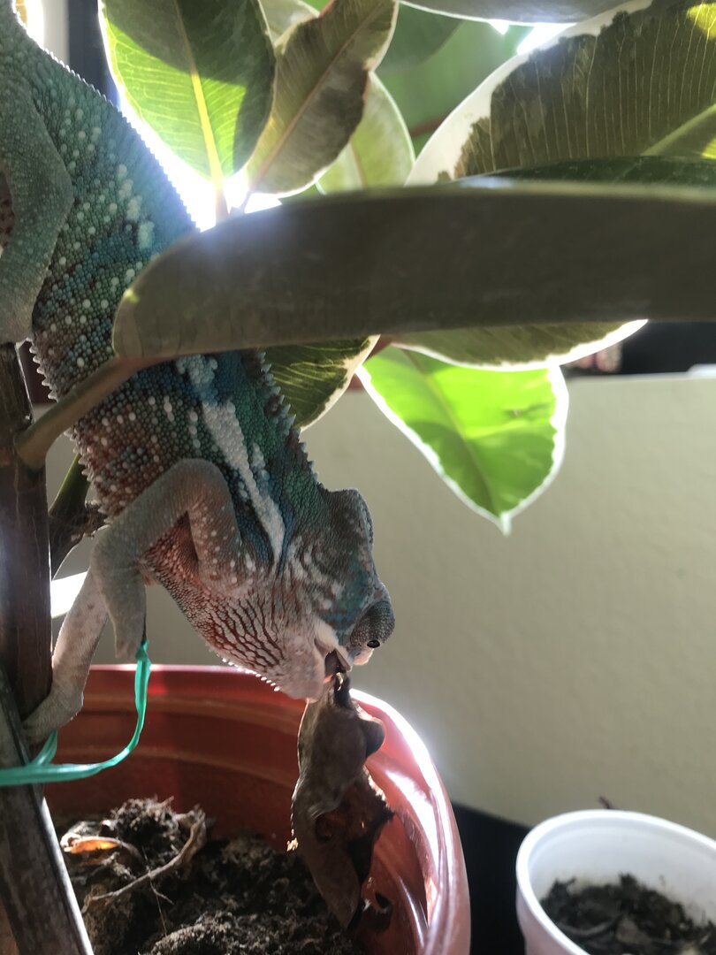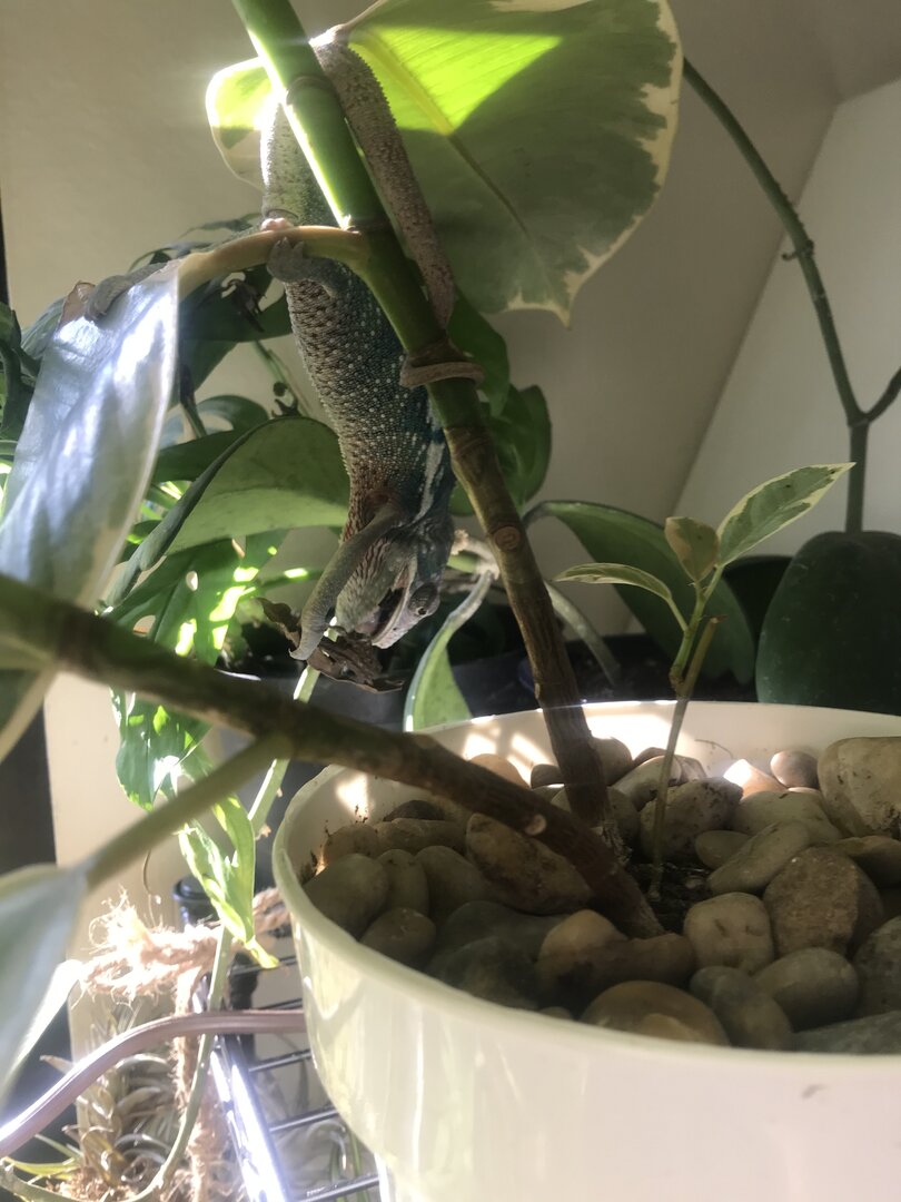 I am concerned because I have not seen him eat insects in a while (maybe I just haven’t seen it), yet Every time he gets the chance he eats sooo many dead leaves. He’ll eat one the size of his body no problem. I don’t stop him because I’m not sure if it’s similar to dogs eating grass or not. I recently listened to a podcast with Bill strand and some lovely British guest about bio-active enclosures. The guest mentions that in the wild chameleons will eat leaves, rocks, dirt, things that get caught on bugs, etc. quite commonly in the wild, and they actually get extra minerals & nutrients from those things. So I’ve been letting him eat dead leaves, but it does feel like a lot. And recently he tried eating small River rocks that were almost the size of his head that I used to cover the potted plants. I thought they were quite large, and I stopped him from eating them even though he tried several times, and quickly changed them out. I made sure he got his proper dose of dusted vitamins and calcium. I give him calcium without d3 just about every day, and vitamins with d3 once every other week. Am I not giving him enough vitamins? I feel like I have the proper uvb with the long 24’’ fluorescent bulbs