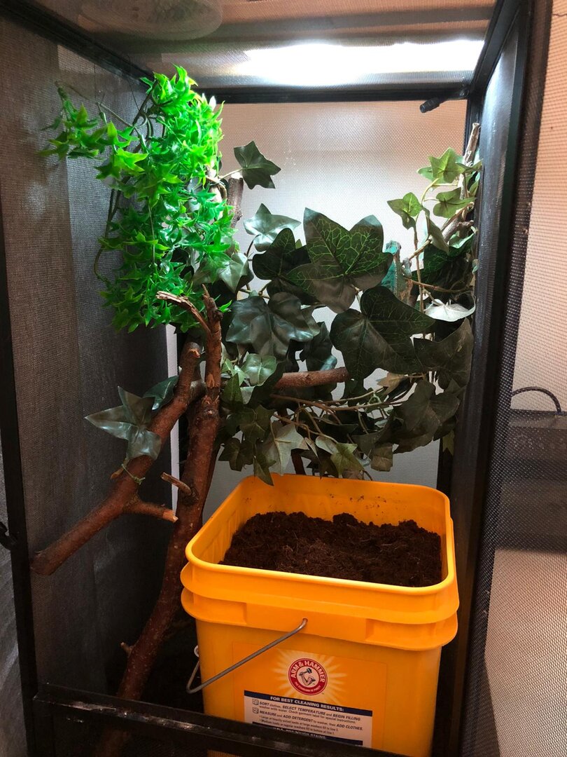 -Because of her sudden change in appetite as mentioned above, I thought it was that she could be in fact ready to lay eggs, so I added a laying bin with coco coir in the yellow bucket as seen in the picture. I thought it wouldn’t hurt to have it in there just in case. Chameleon was acting normal again. She was moving around in the cage, but still would not eat.