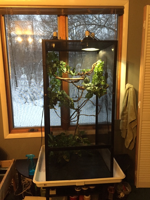 He is in an XL reptibreeze screen cage, with uva and uvb lights, and gets sprayed down 3-4 times a day with a constant dripping system, his cage ranges from 85-90 degrees F during the day, aproximately 65-70 at night and the humidity is usually around 50-70% and gets fed crickets everyday, dusted with calcium without D3 everyday, vitamins 2 times a month and D3 2 times a month.