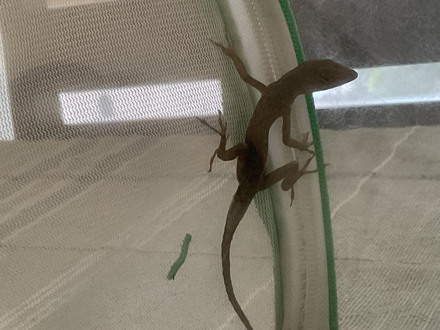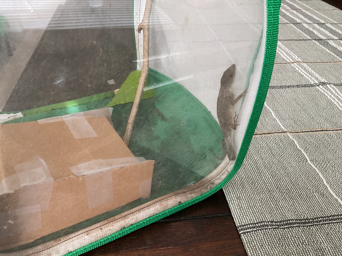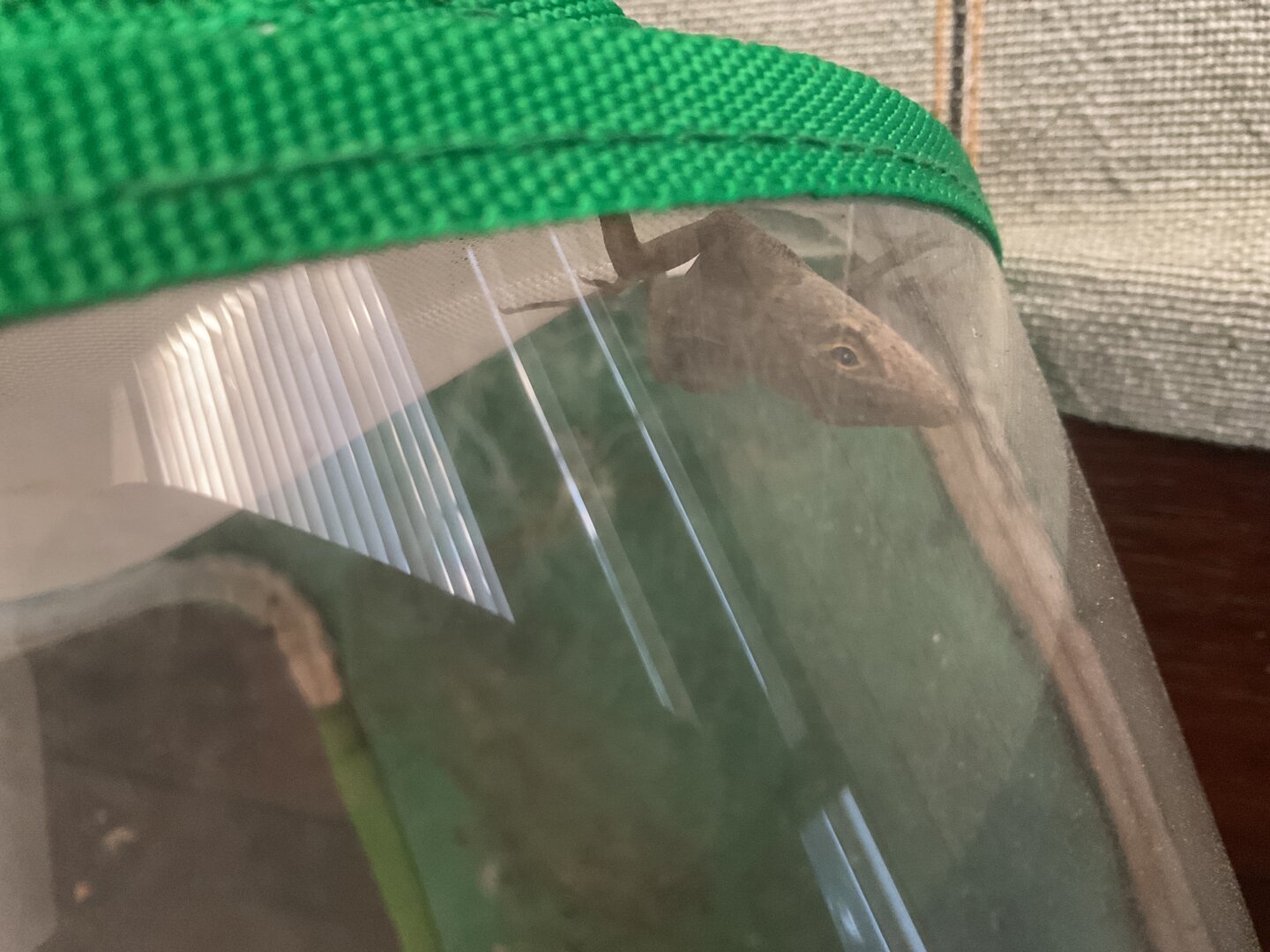 So, I was walking around my neighborhood when I found a brown anole male on the sidewalk. He was just laying on the sidewalk. I picked him up and thankfully he was alive, but he was so skinny and cold. I took him inside and put him in a little butterfly cage since I don’t have any other cages currently.