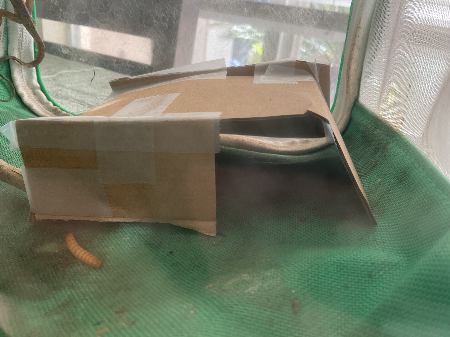 When I put him in his cage, I left him in there for about an hour or so. I came back and he still didn’t move at all. I eventually put a tiny hornworm in there and a mealworm for him. He did move a bit but he was like hopping.