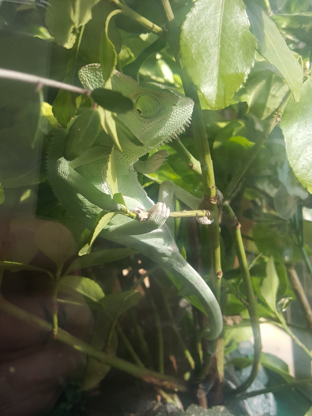 I also have a 40 gallon tank with glass siding but drift wood stumps and a mixture of real and fake leaves and branches out of the tank and up giving him maybe a foot out where it's caged in. I'm using I think it's called blue spotted day and night bulbs. They're 60 watt but I'm also using a small ceramic heater in both areas. I keep the red bulb on 24/7 as long as that's where he is and there is a bask area for underneath. I'm using the day during the day, even with all of the natural sunlight because I don't understand the uvb stuff and it freaks me out. I also have a hydrothermal reader thing. Ive started keeping small humidifiers throughout the house but in his tank I have a small dog thing that I caged and it flows steam through the bottom that also has around one inch of water but is covered with rocks, plants, stumps, etc. His humidity stays around 30 40 sometimes it does go to 80 but never lower than 30. The temp during the day is never lower than 70 in the midsection of each area, at night sometimes 65 is lowest. (He does have his bask spot though that stays at least 85) I made a drip thing so that's constant. I hand mist, every two hours for about 30 seconds. Every six for 2 minutes. And randomly in between. I'm just scared and I have no idea what to do and he's wild as heck. And earlier I think he cut himself on a stump what would it look like? Little water drops? Please help, anything is so appreciated.