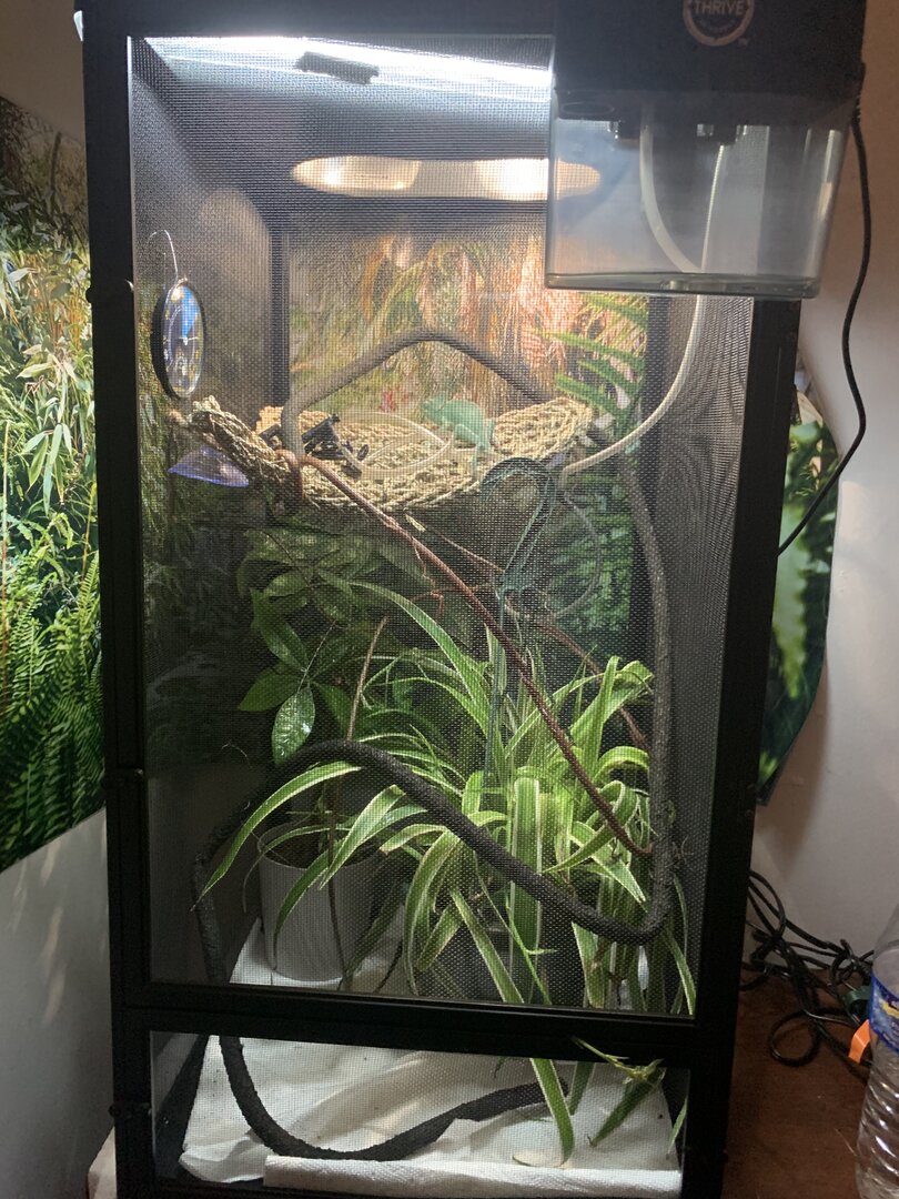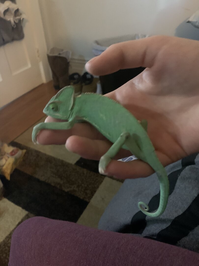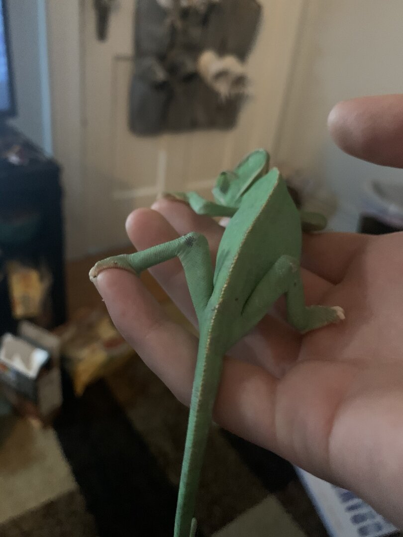 Hi everyone. So a week ago me and my boyfriend got a veiled chameleon from the pet store. He’s been eating and drinking fine. Good colors. He has a misting set up a UVB light, two “veiled tested” real plant and fake vines and such to crawl on. His tank is in the 70s at night and around 80 ish during the day. Last night instead of settling on a branch and going to bed like usual he made his way to bottom of cage and appeared to be almost flailing/digging around. At first I feared impaction but he did poop the next day. He did this all night. In the morning I took him and and held him. It seemed once he had my fingers to grip too he calmed down I then placed up to bask and he started acting fairly normal again. My boyfriend said he moved around and was misted and pooped during the day. I got home late and once again he was on the floor almost writhing around moving arms slowly as if trying to find something to grip. I picked him up and he seemed to calm down again. I can feel almost a clicking in his throat/stomach. Can’t really hear it just feel it every other second. He also occasionally opens his mouth. He can’t seem to sit still at night and he won’t sleep. I know holding him isn’t good for his stress but he only seems to be able to sit still if he has all my fingers to grab onto. Also not entirely sure how old he is or if he’s even a boy at all. Pet store said he was but who knows how reliable they are