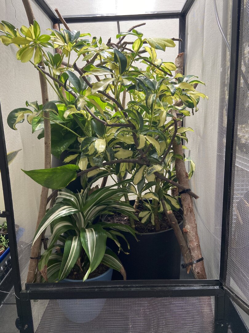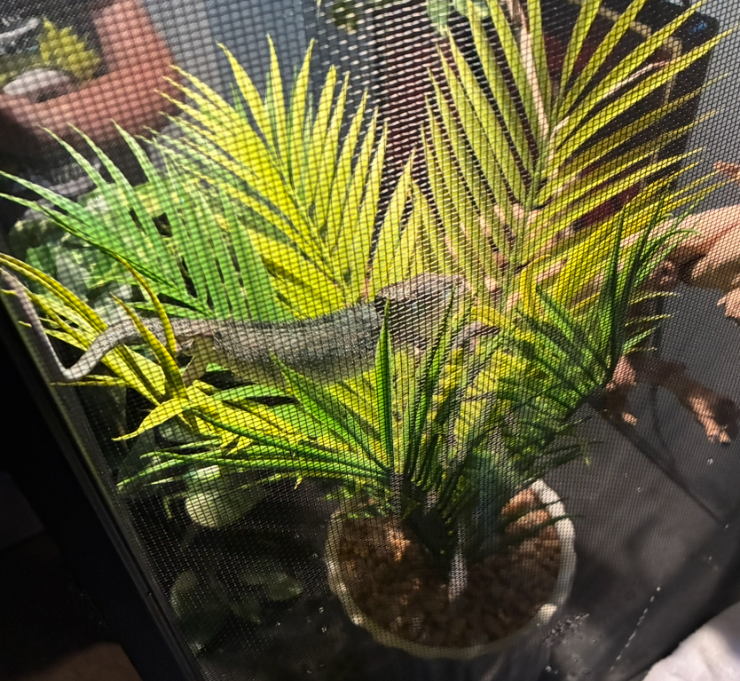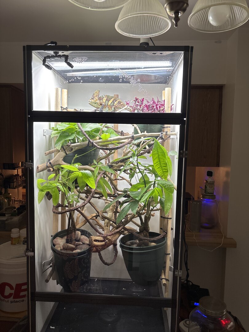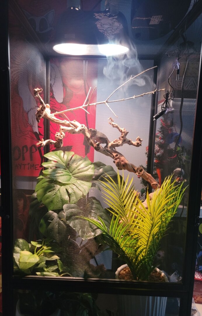 I'm currently feeding him pinhead crickets(small and greyish?) As I heard 6 months eat little ones. He's been drinking water as I'm manually misting and I do have a fogger. The person at the store only gave us a fogger saying that'd be enough(which from reading a lot on the forum doesn't sound correct). The cage is 18 by 18 and 36(?) He's no bigger than my hand, hence photo. There's picture of his cage. I did learn it needed to have layers to it with lower Temps as you go down and I tried my best with what I could to kinda give that for him.